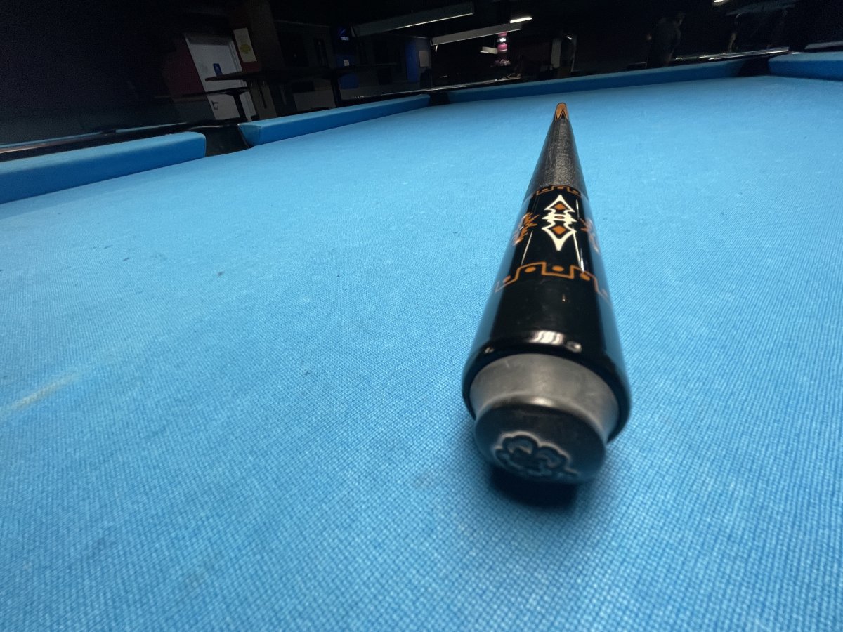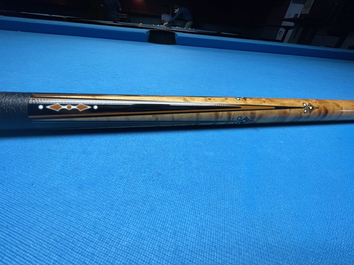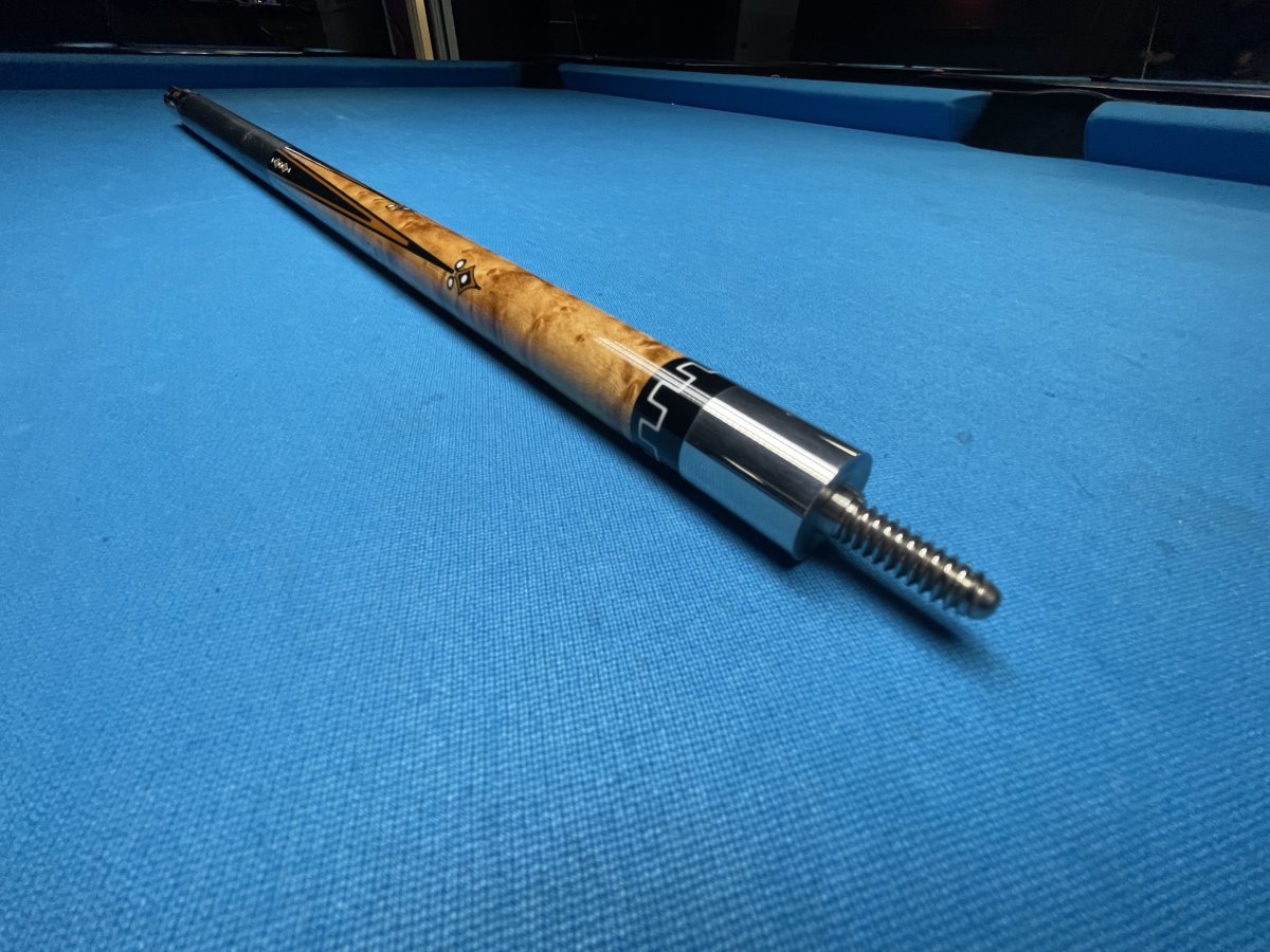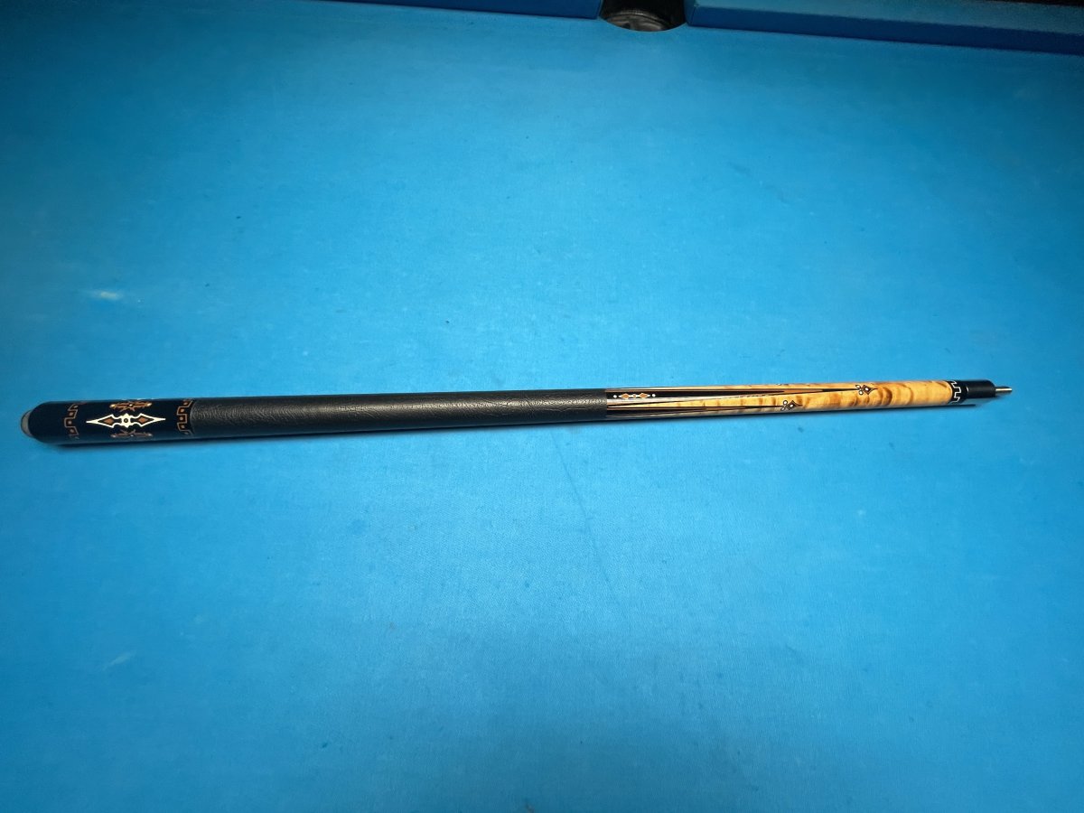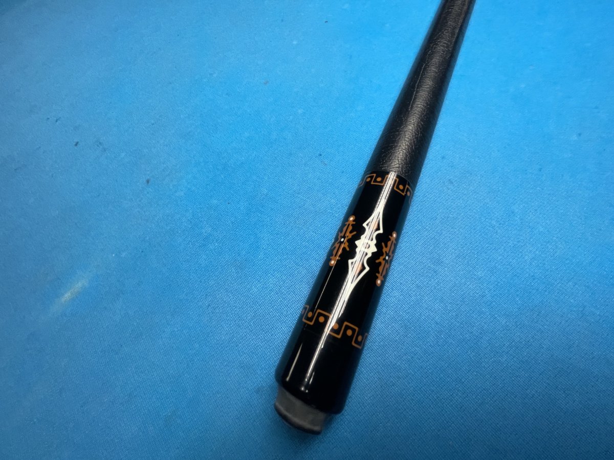 This is a hard to describe cue that was made around '92-'95 that comes with 4 original shafts. The model # is EM5B. The butt is 15.4oz., the shafts are all around 13mm and weigh about 4.3oz and 4.4oz. The cue has a modified 5/16x14 pin with stainless steel joint. As I mentioned it's hard to describe but has stained bem with ebony points in the forearm along with various inlays. The butt is ebony with inlays. Leather wrap. The butt rolls dead straight. The shafts have just the slightest of a taper roll. Two of the shafts are unplayed. Asking $1,200.00 plus shipping or local pick up.