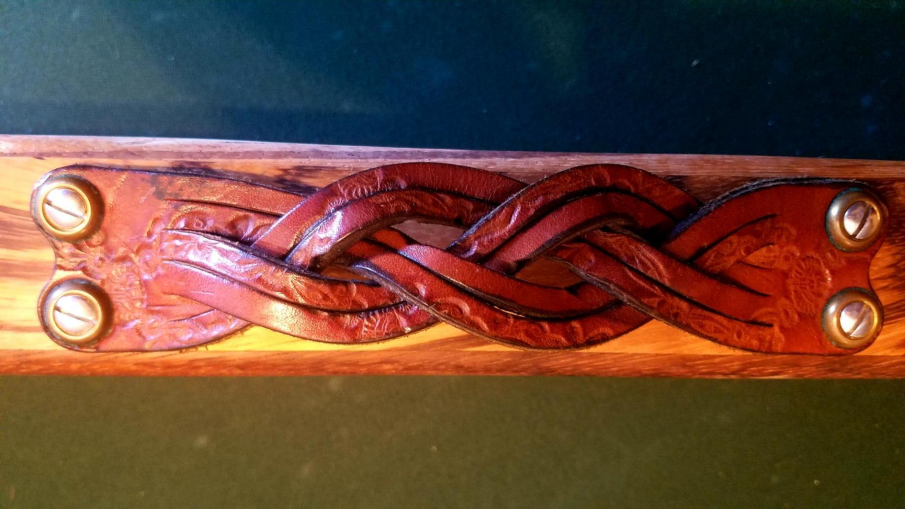Really unique, the wood veneer work is very well done, and the Celtic knot shaped leather handle is special. Interesting, and uncommon.