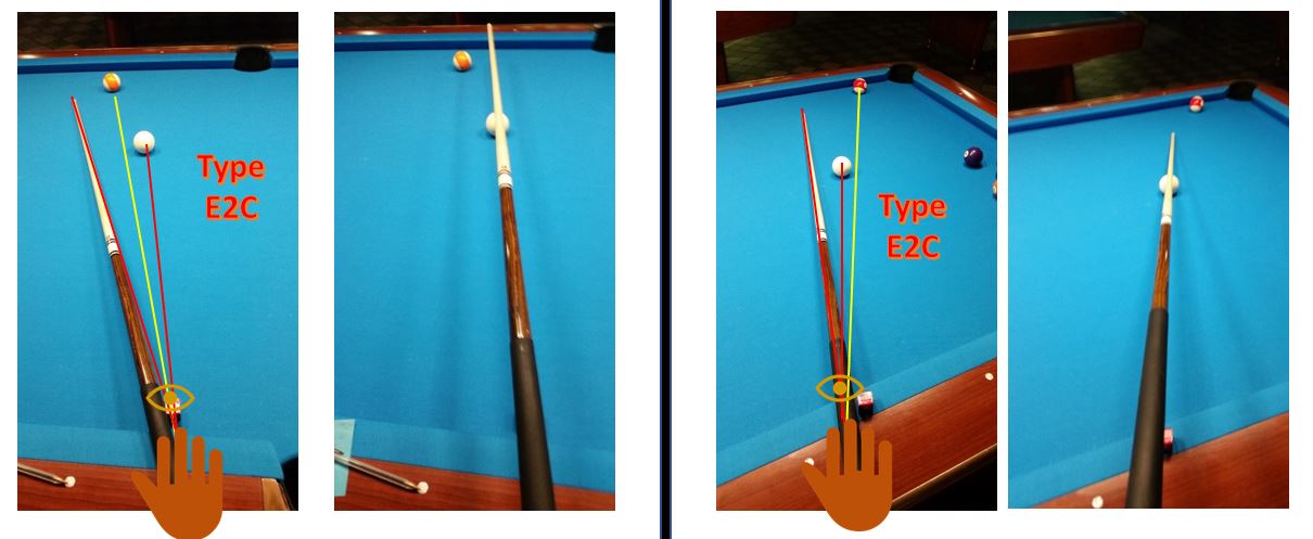 In each shot the player must always have the E2E or E2C visuals. As long as you see those visuals when you are approaching the CB, with the tip of CB in the center of the CB, you are certain that you can pocket the OB.