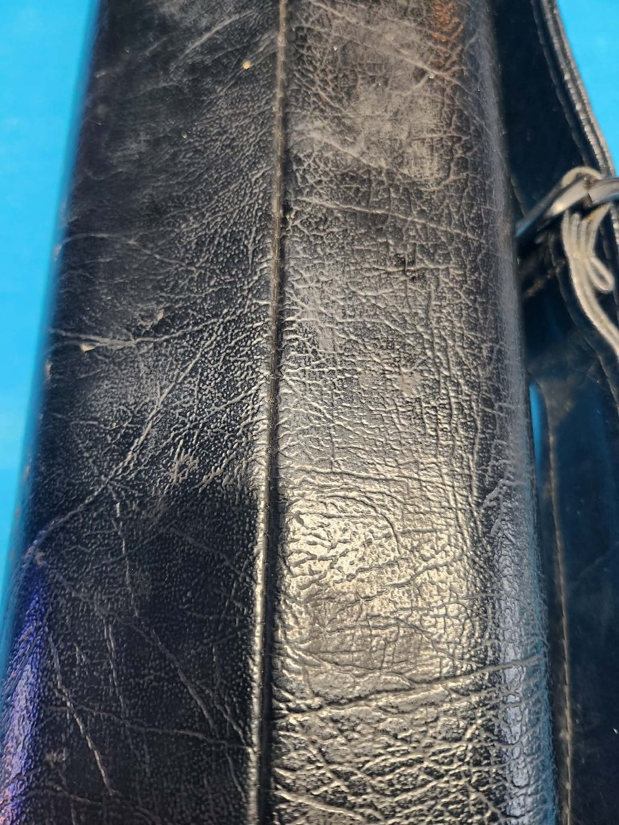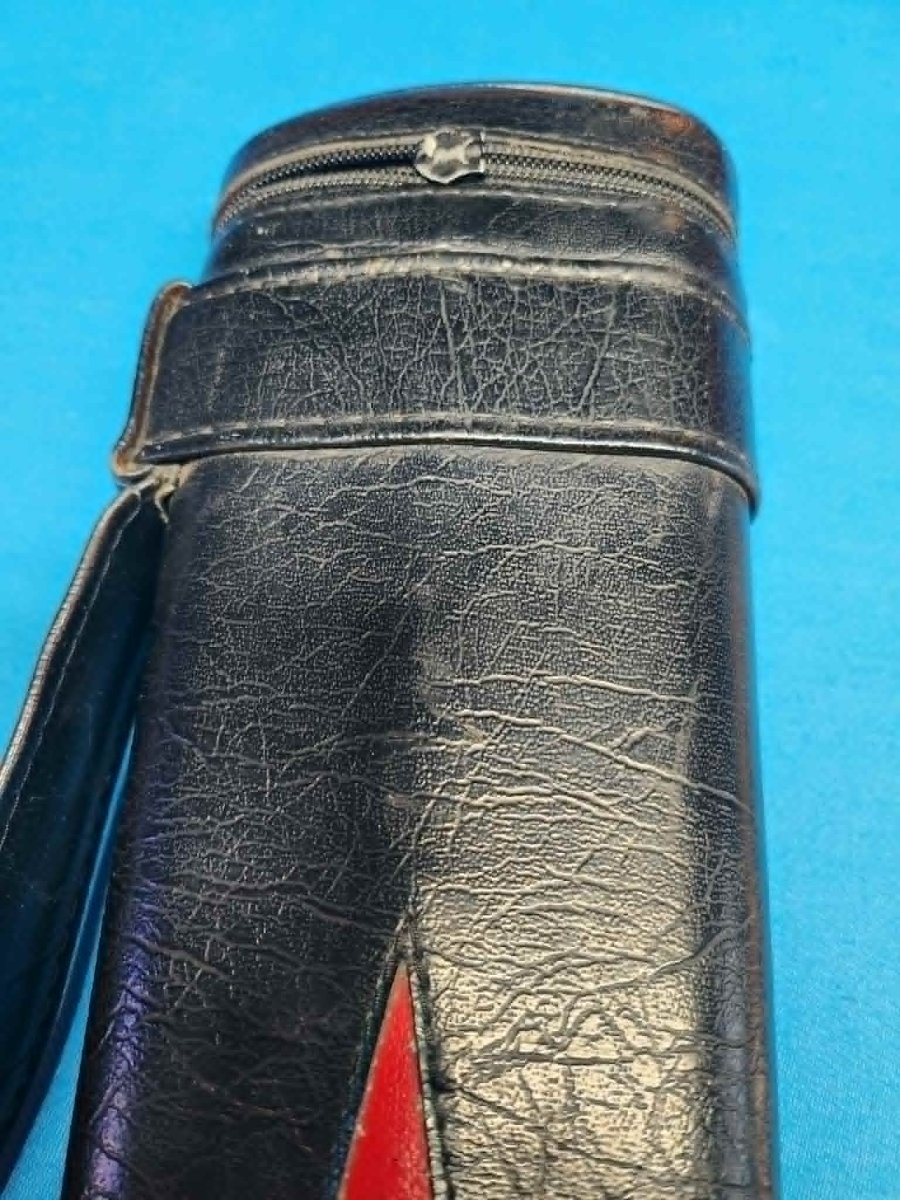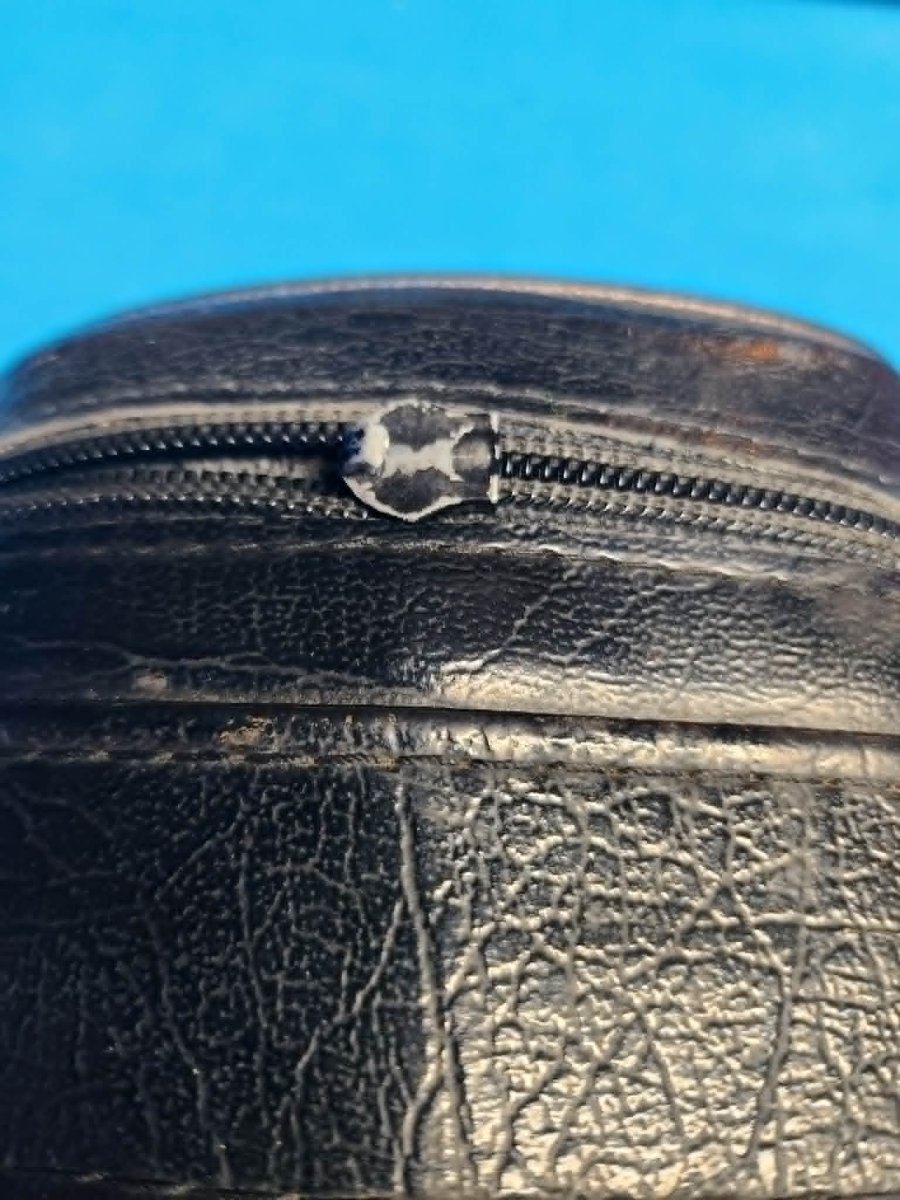 Case: Shows some honest vintage wear. The small metal handle hasp for the zipper is missing, but the zipper itself still works fine.