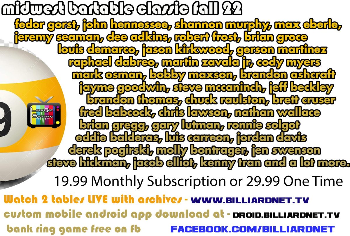 The Midwest Bar Table Classic is upon us in a few hours. This is without a doubt my favorite partnered event. My private platform Billiardnet.tv gets to shine at this event featuring 2 table switchable streams, our custom android application and a streaming platform that actually works without tech support or intervention.