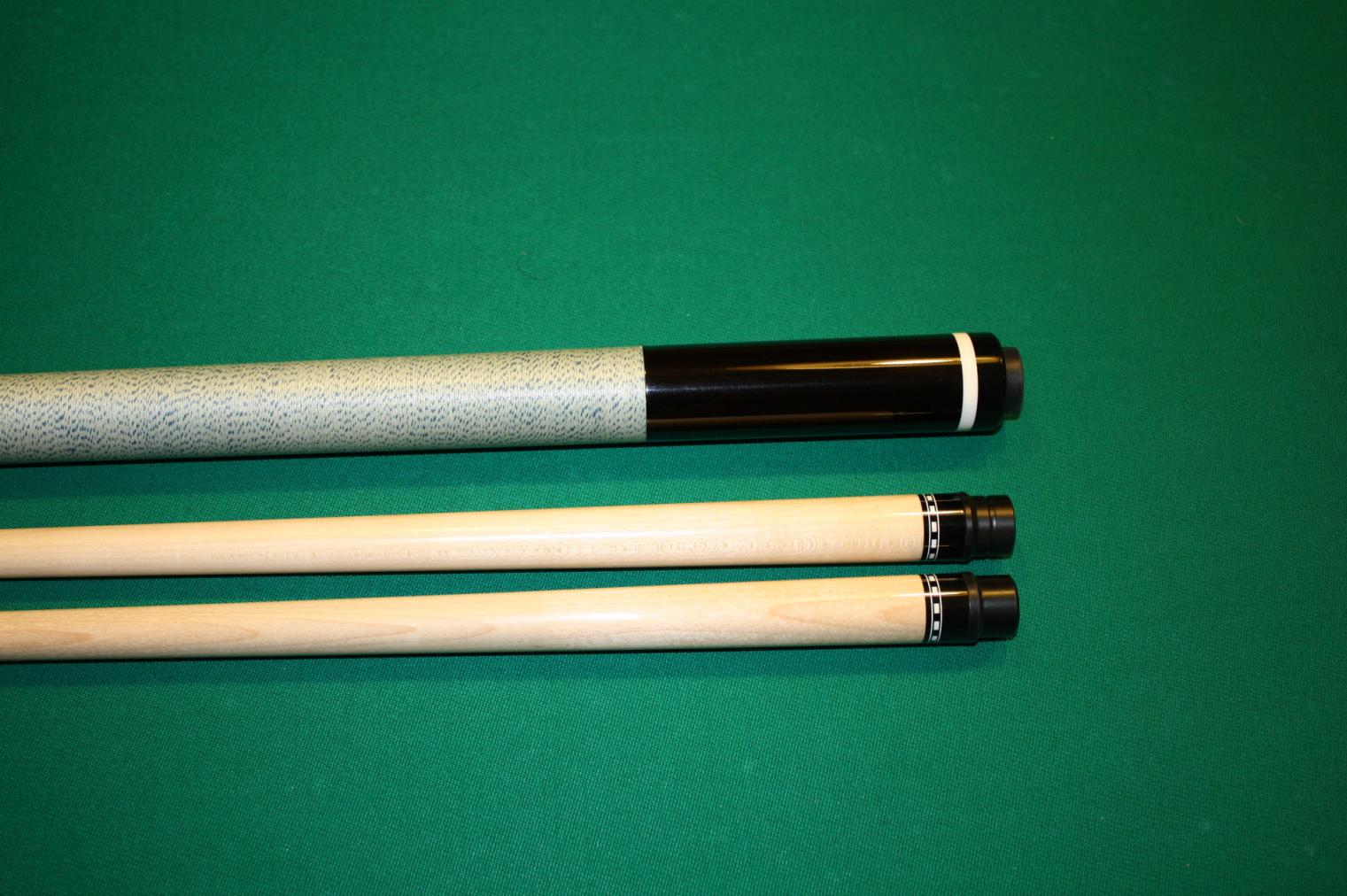 Beautiful cue here and outstanding player. Hoppe Ring, sleeved joint, Radial pin that's engraved by Mike, 5 Veneers. Basically mint condition. I order the 2 shafts to be 12.85. But came with one at 12.9 and other at 13.05 and both 3.8oz. Lepro Tips. Butt is 15.5oz. Hit like 12 balls years ago and been in display case ever since. Only hit with one shaft. Butt rolls perfect, one shaft tiny movement when rolled on table, other shaft has small movement. Excellent players cue with great traditional look. Comes with JP's. NO Trades! $SOLD Shipped. Paypal add the 3%