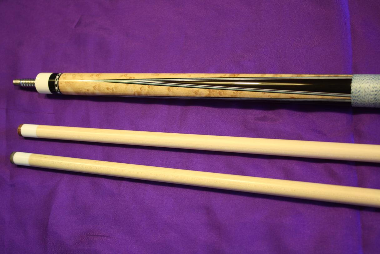 Beautiful cue here and outstanding player. Ivory Hoppe Ring, Ivory sleeved joint, Radial pin that's engraved by Mike, 5 Veneers. Basically mint condition. I order the 2 shafts to be 12.85. But came with one at 12.9 and other at 13.05 and both 3.8oz. Lepro Tips. Butt is 15.5oz. Hit like 12 balls years ago and been in display case ever since. Only hit with one shaft. Butt rolls perfect, one shaft tiny movement when rolled on table, other shaft has small movement. Excellent players cue with great traditional look. Comes with JP's. NO Trades! $SOLD Shipped. Paypal add the 3%