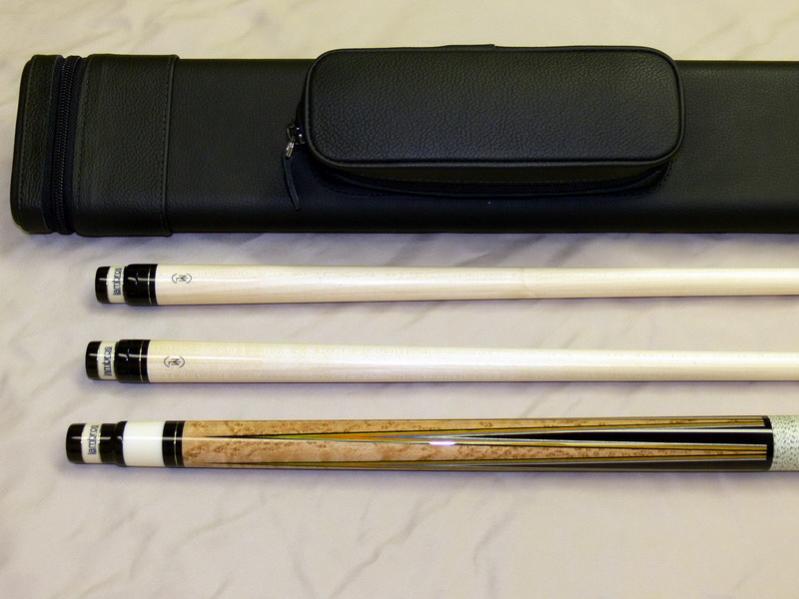 Cue has 2 LAMBROS LD shafts at 12.75 mm each, Tom Hays ultra skin tips, and
