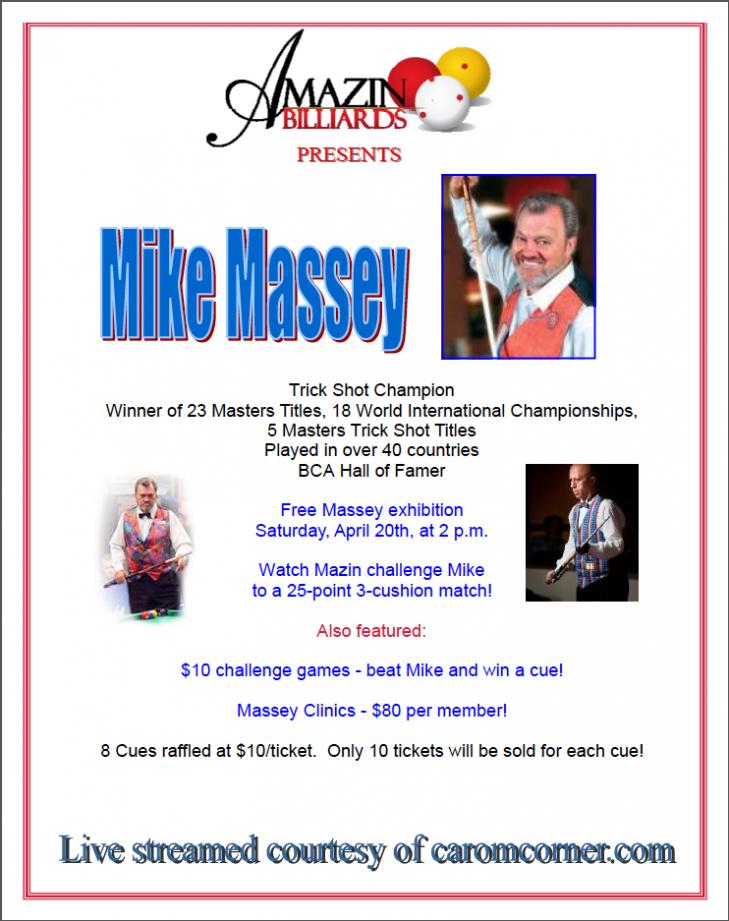 1 hour after completion of this will be a 3 cushion match with Mike M vs Mazin Shooni.