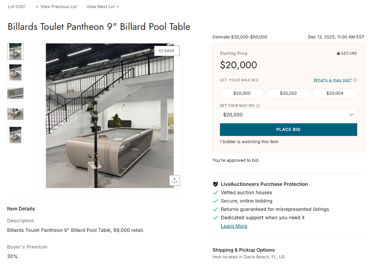 I just saw an auction for a very expensive pool table. The minimum bid is $44,000 and there is a buyer's premium of 30%. The table originally sells new for $69,000. So, why would someone buy a used table with a opening bid of $44,000 plus 30%, that's like $57,000 and you still have to ship it. I bet the new table at 69k comes with free shipping and a warranty.