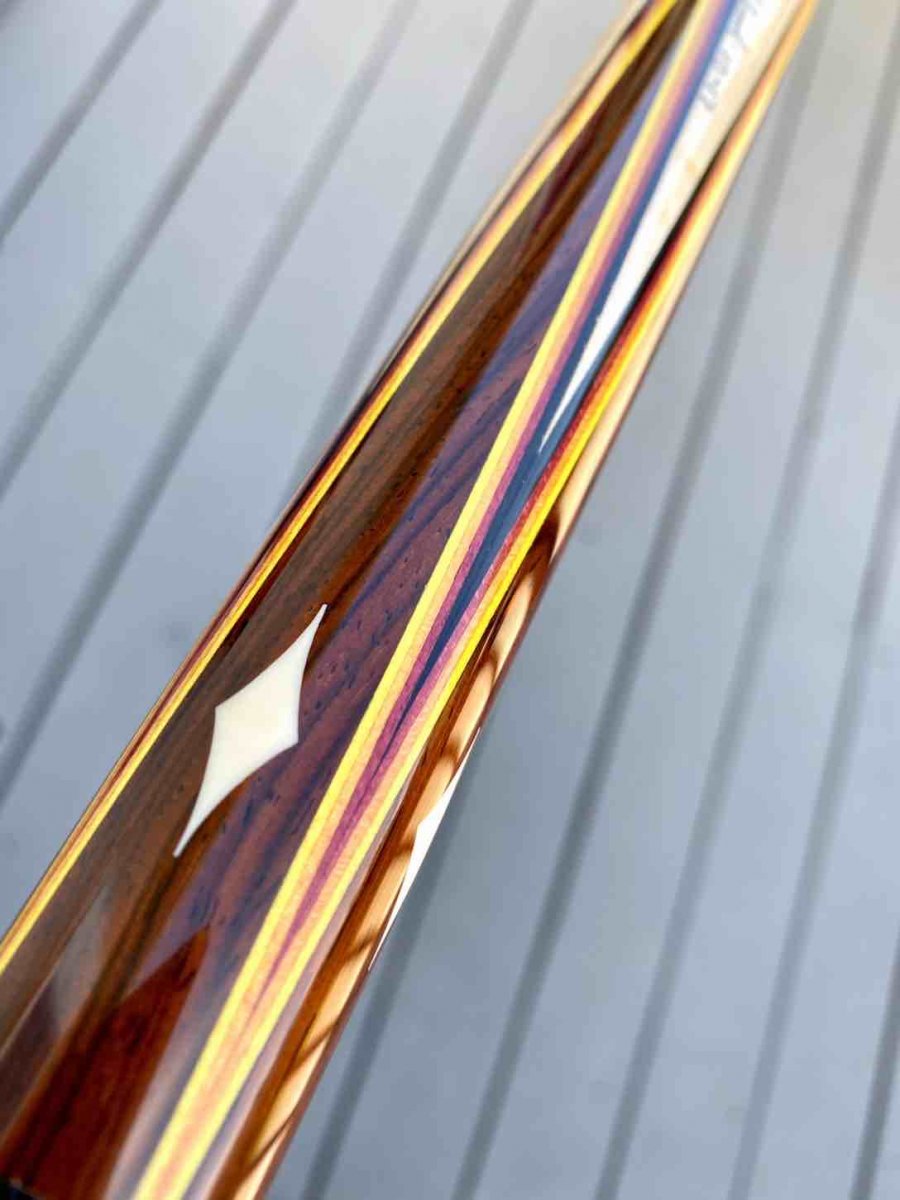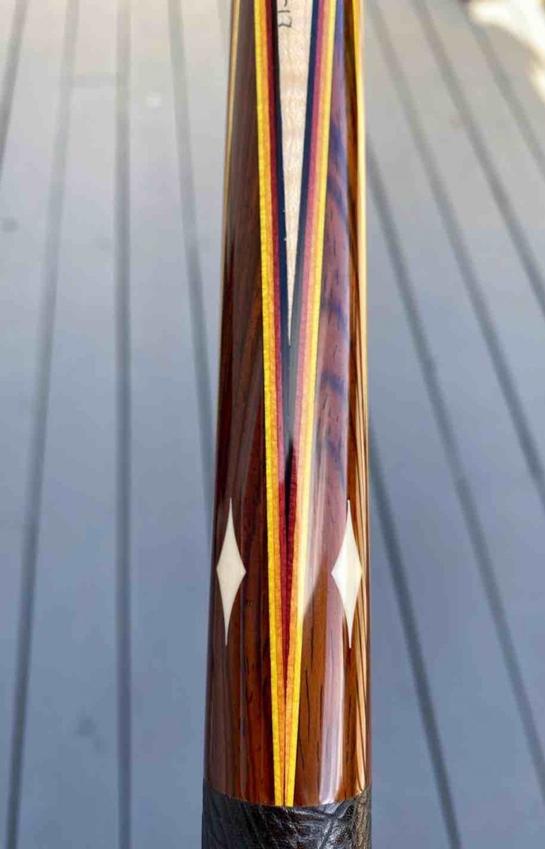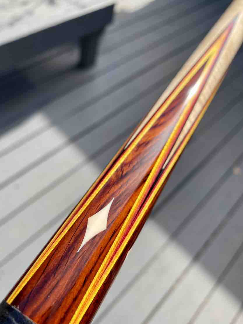 Just refinished by Ariel! Cue is in MINT/like new condition. Has not hit a ball since being refinished. This cue was made by Ariel Carmeli from a John Davis full splice blank. Mexican cocobolo into nicely figured curly maple. Thin sleeved SS joint with juma hoppe ring and diamond inlays. Super nice dashed cocobolo boxed ring set at the joint/shafts. Incredible shaft wood here, with what I believe are triangle tips. One shaft is new/unchalked/unhit. One shaft test hit. 3/8-10 modified pin.