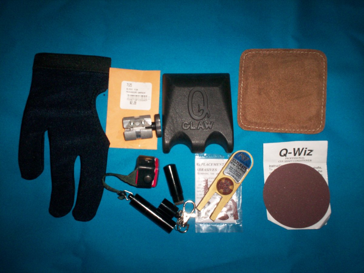 selling as a bundle. Will Not separate. never worn glove, 2 cue Cue Claw, Porper mushroom graser & extra blade, Ultimate Tip Tool & replacement abrasives, 2 tip picks, Wiz shaft conditioner, Porper shaft polisher. all items are either new, like new, or in good condition. over $100.00 new. asking $60.00 for all. payment by PayPal, not as friend or gift. will ship USPS Priority, lower 48 states only.