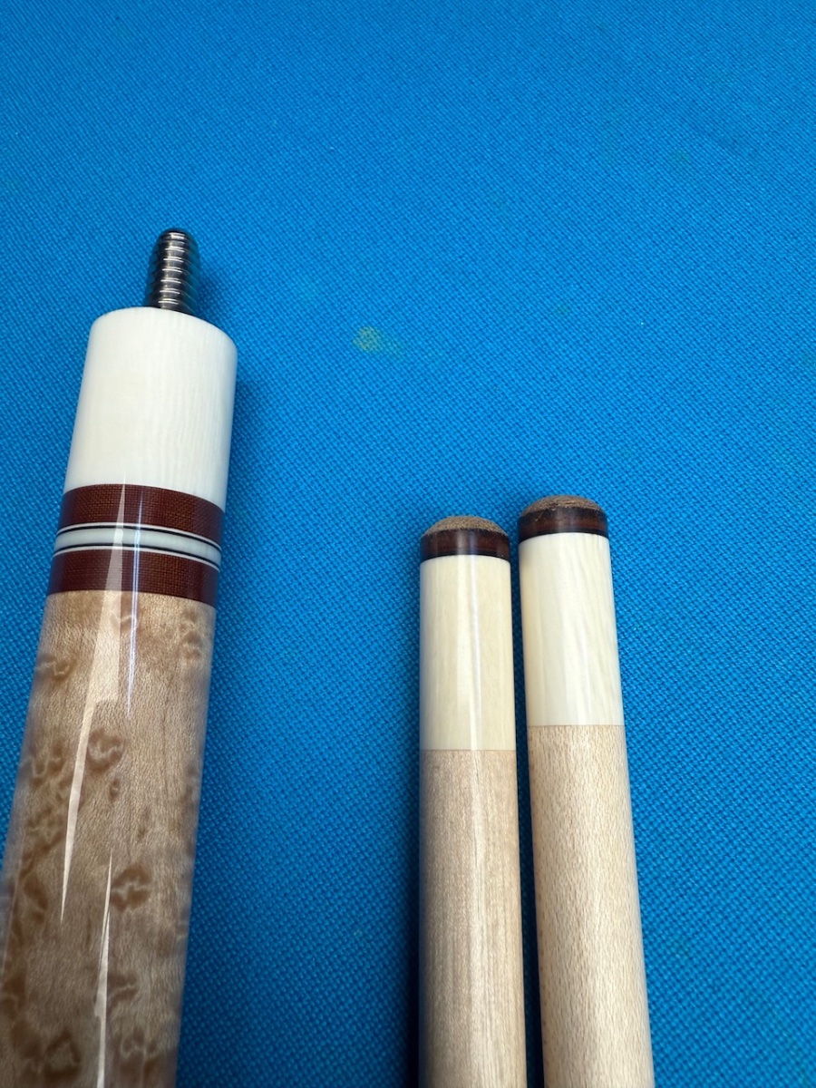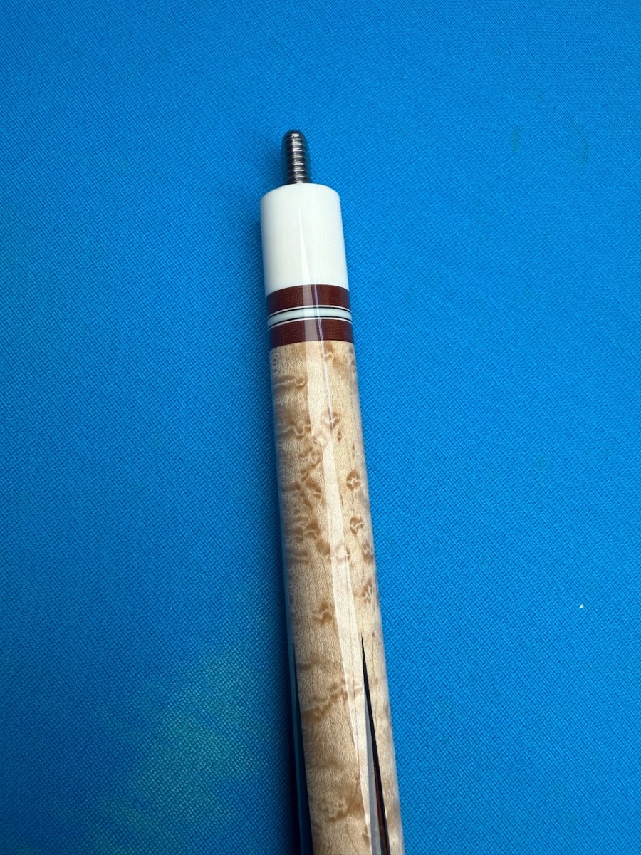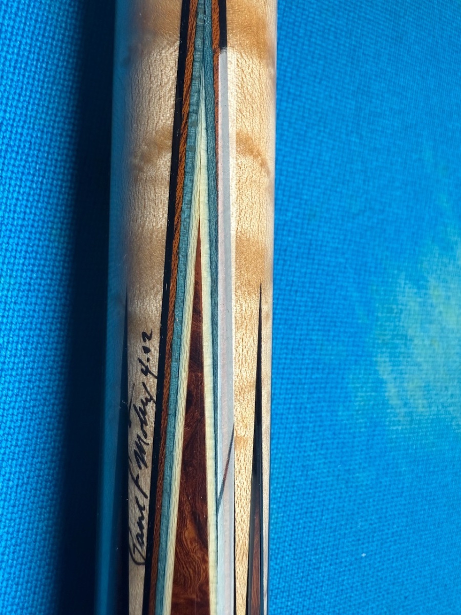 One of the best looking Mottey’s I have seen. Story behind the cue is that the original shafts got to be under 11-12mm and had become unusable. When the cue was refinished, Randy Mobley made two new shafts with the original rings from Paul. Two incredible cue makers have worked on this one.