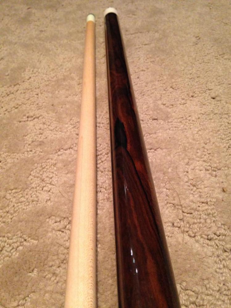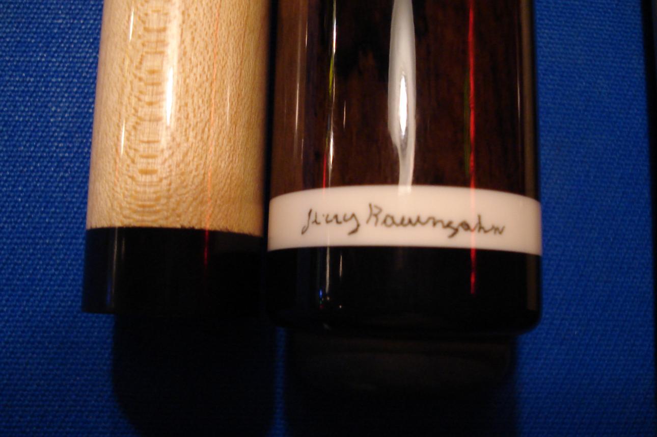 Jerry Rauenzahn cue, Solid Zircote, not sure of joint or ferrule material, 3/8-10 pin. 1950's Katz shaft blank. New near mint