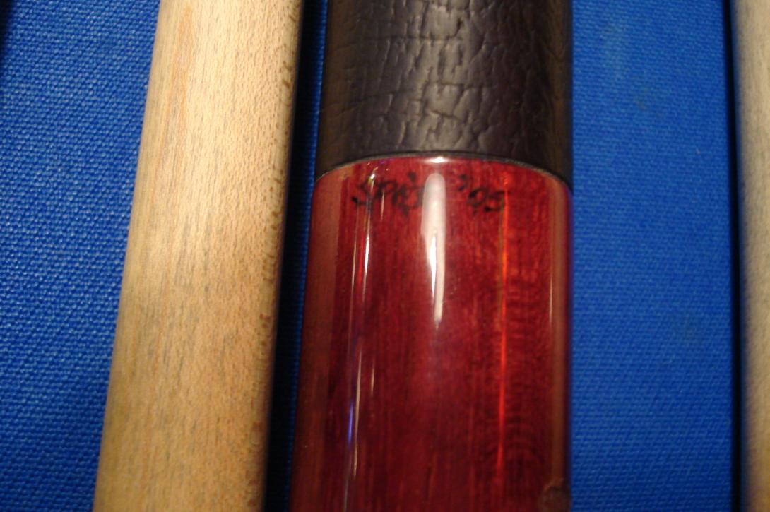 Jon Spitz cue signed 2005, Solid Purpleheart with leather wrap, 3/8-10 pin. Butt weighs 14.7oz , shaft 3.7oz.