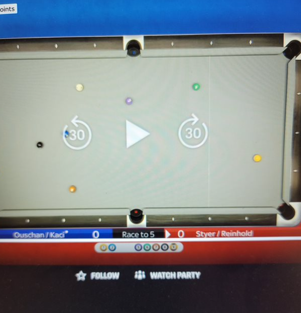 And then Kaci flubs the 5, missing by half a Diamond on an easy shot in the corner! Commentators letting him have it, he’s really struggling out there. Fortunate leave though and Styer forced either a thin cut or kick on the 5. We get an incredible shot by Tyler, hiding the cue on his kick shot and forcing Albin to take a difficult kick of his own. He could, USA takes ball in hand, and hard to see them losing the rack here.