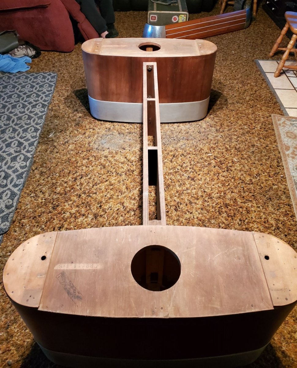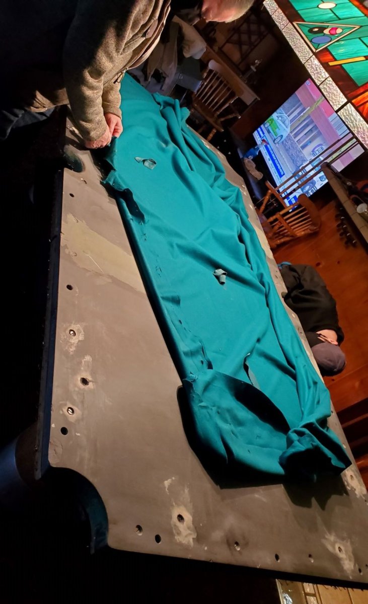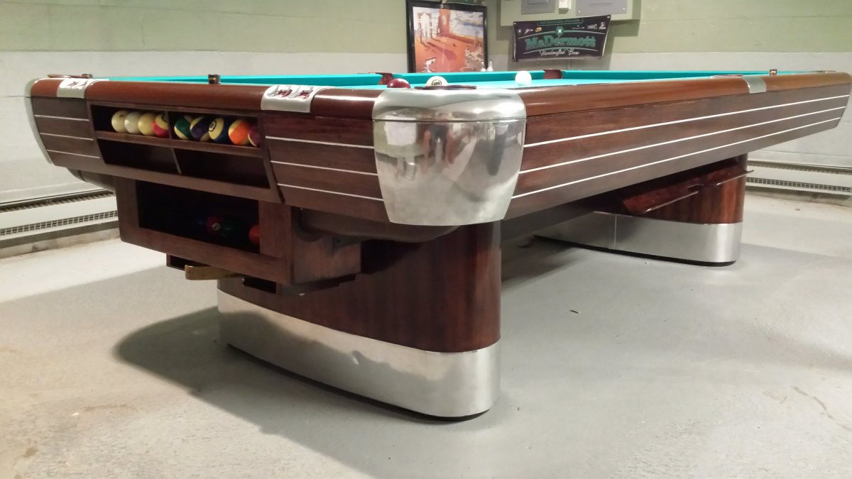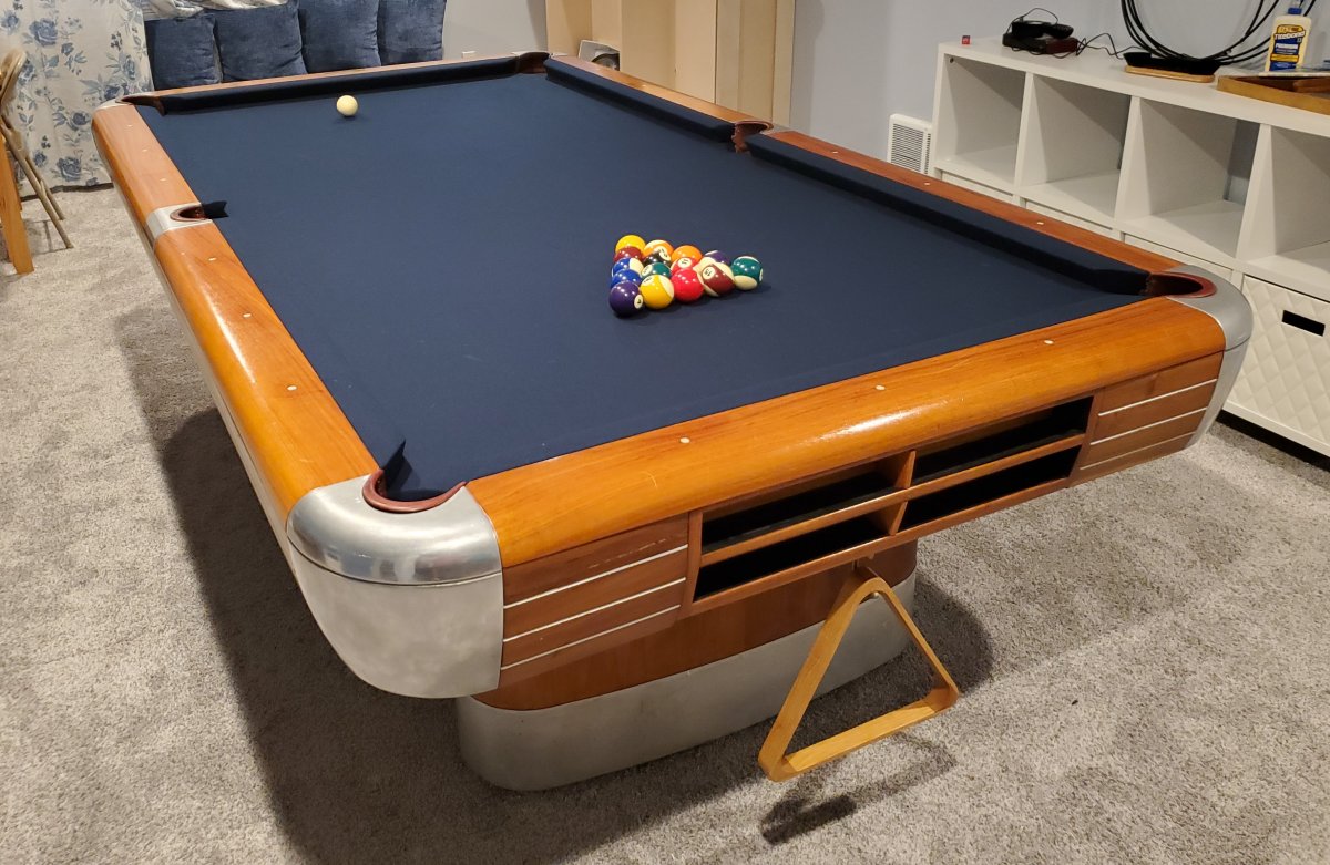 We recently bought an anniversary table for 1900.00. It seems to be in good condition. It does need some cosmetic repairs but the slate is solid. The previous owners used bondo for some reason to connect the slates together instead of beeswax. It was a little nerve wracking when the pro's I hired were taking the table apart. It came apart with a little persuasion without damaging the slate. I've been trying to date the table. It's a model D-C. Here is what it looks like would love to hear what you think.
