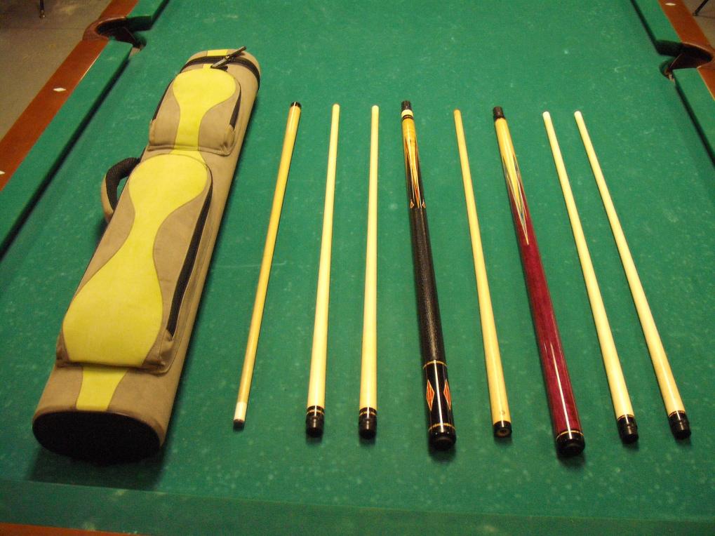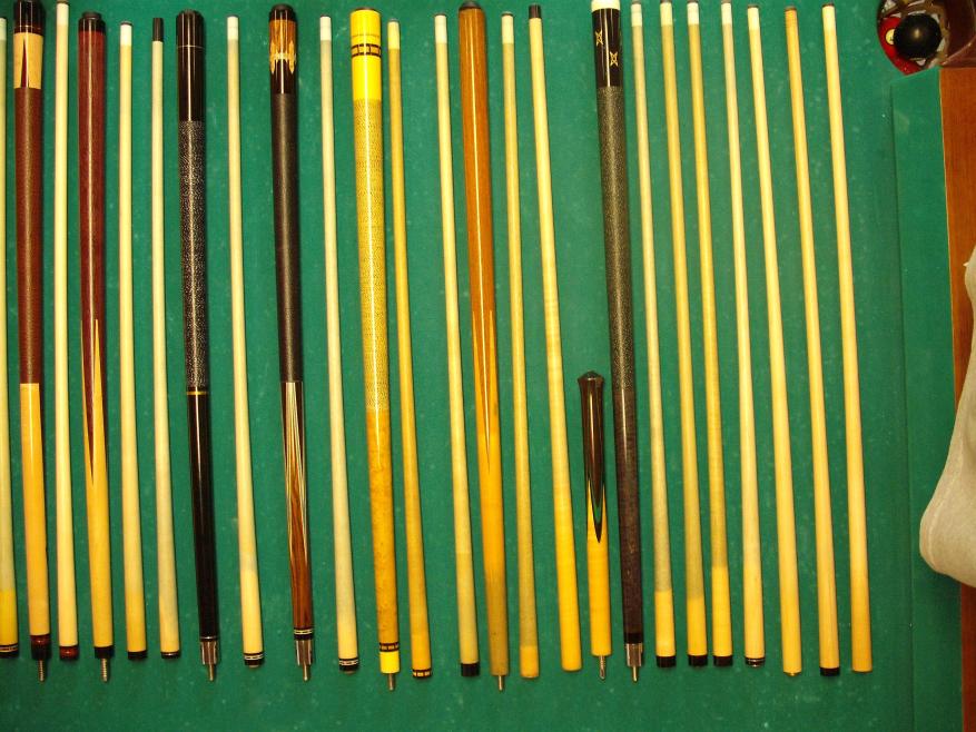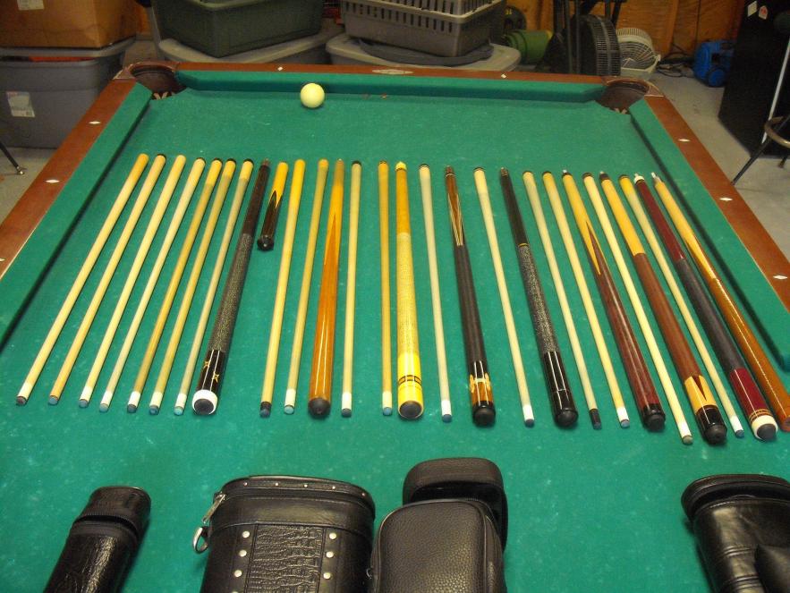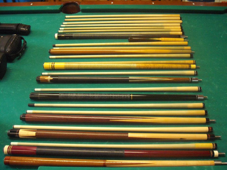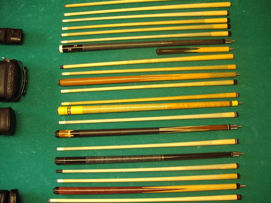 Bottum to top from second pic: Unknown B/J, Paul Sumrall with ivory half joint, Erwin, Varney sneaky, Hammerhead J/B with Mike Johnson tip and ferrule, Jensen, Meucci Original Player, Meucci Original Sneaky, J&J Magic Jump, Joss, various shafts- one is a Scruggs with ivory ferrule and another is an OB-1. I also have a Bobby Hunter shaft with ivory ferrule on the way. Let me know what you think. Be nice and hug the kids.