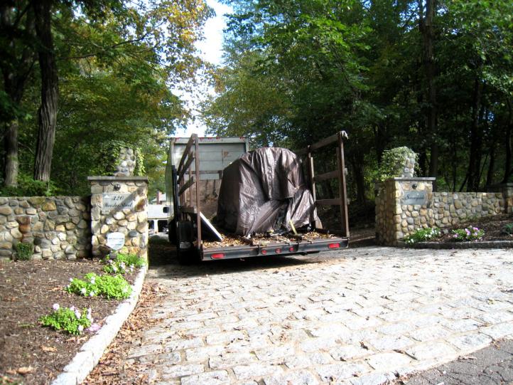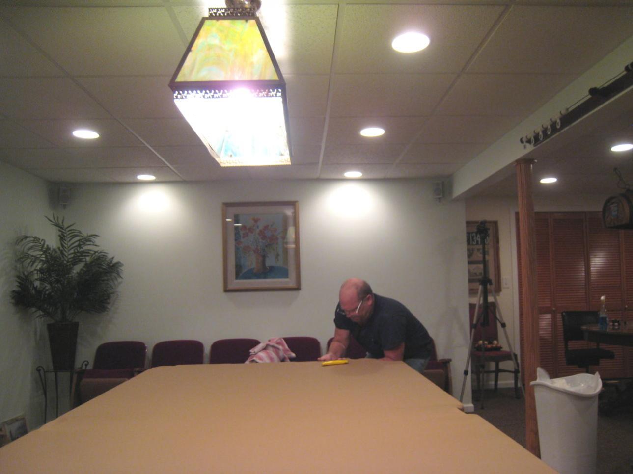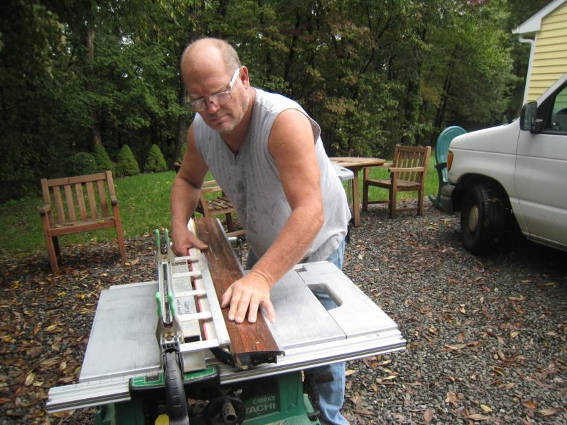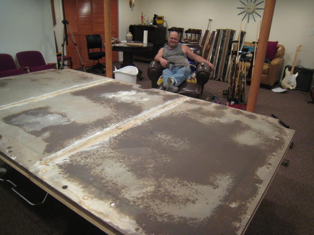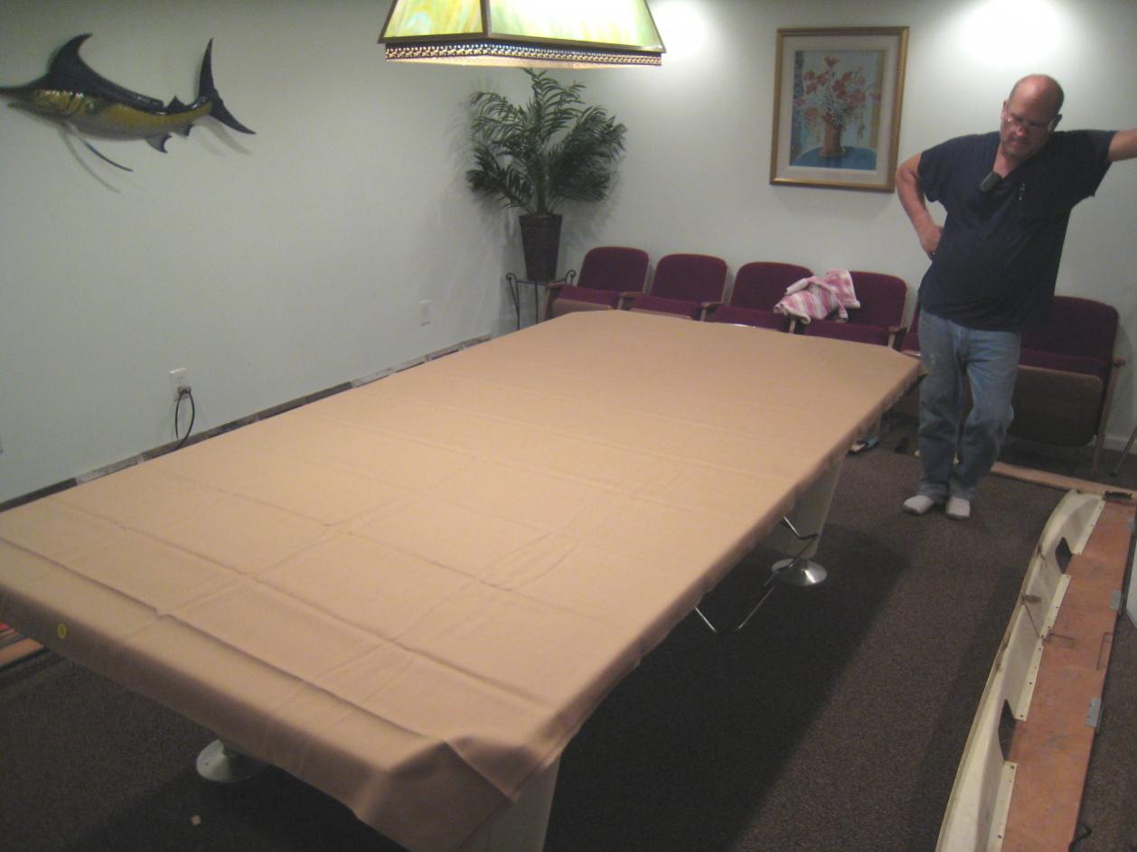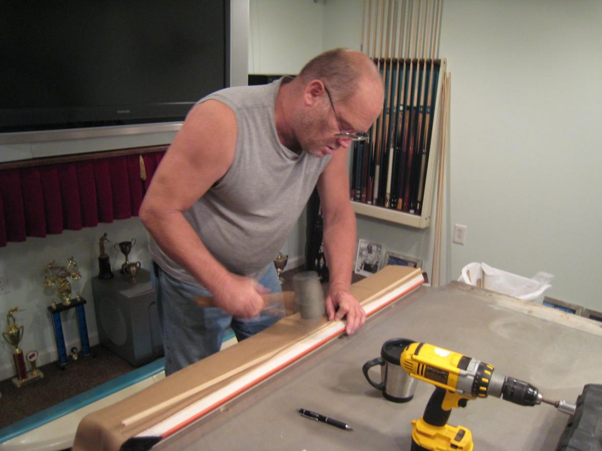Here's the killer, the router job to fix this would make a monumental mess - it couldn't be done in my nice rec room. Okay, so he went out and got his handtruck and heavy strap, next thing I know we're removing three slates from the table, one at a time, humping them up the stairs out to the driveway, onto the sawhorses, routing all wood edges flush, vacuuming them clean, strapping 'em back to the handtruck, downstairs they go and back up onto the table frame. Did I mention it happened to be about 85 degrees and brutal, Louisiana-like humidity that day? :yikes: