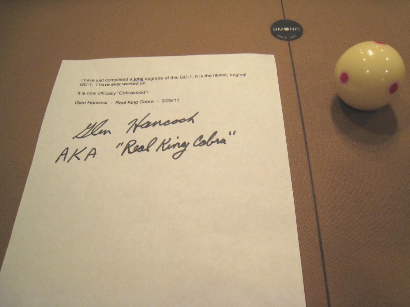 I started out with a beautiful looking, very early, all matching, original GC-1 that played pretty decent (Glen would dispute the playing decent part). My table did have the bucket 5 " corner pockets (5 1/2" sides) but because of Brunswicks pocket cuts you could still rattle and miss balls, unfairly.
