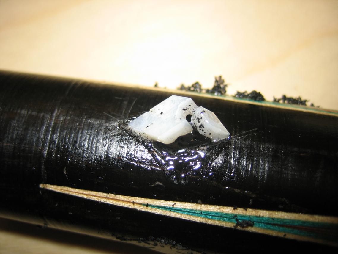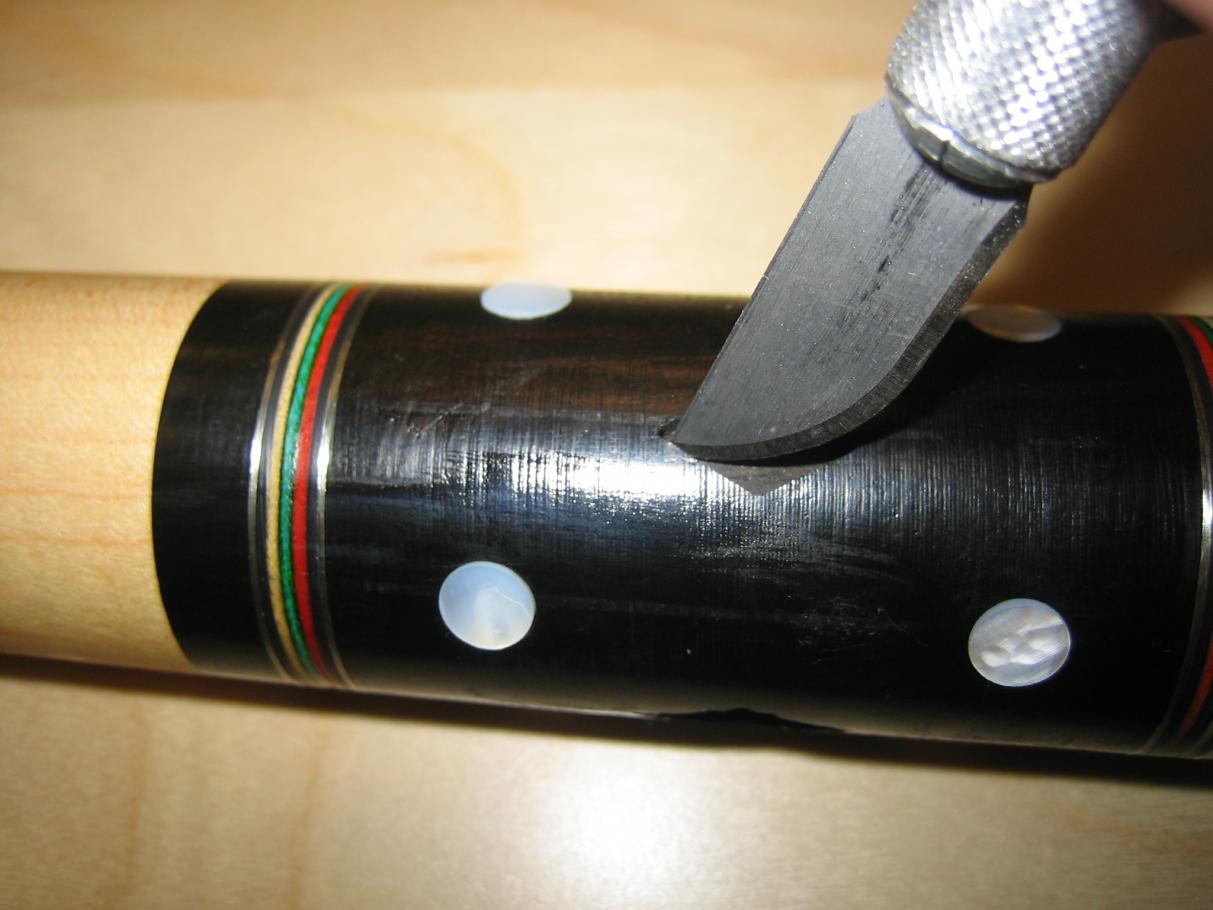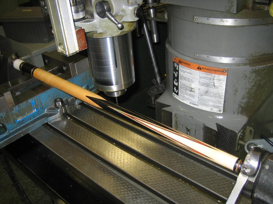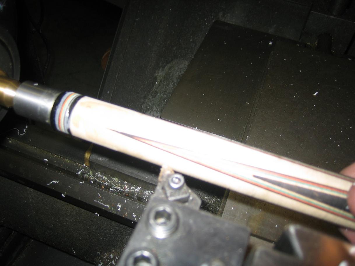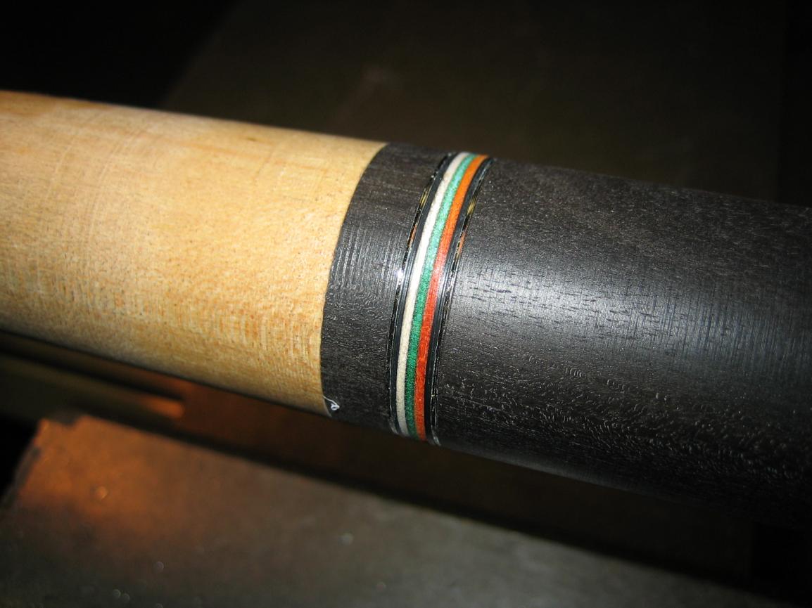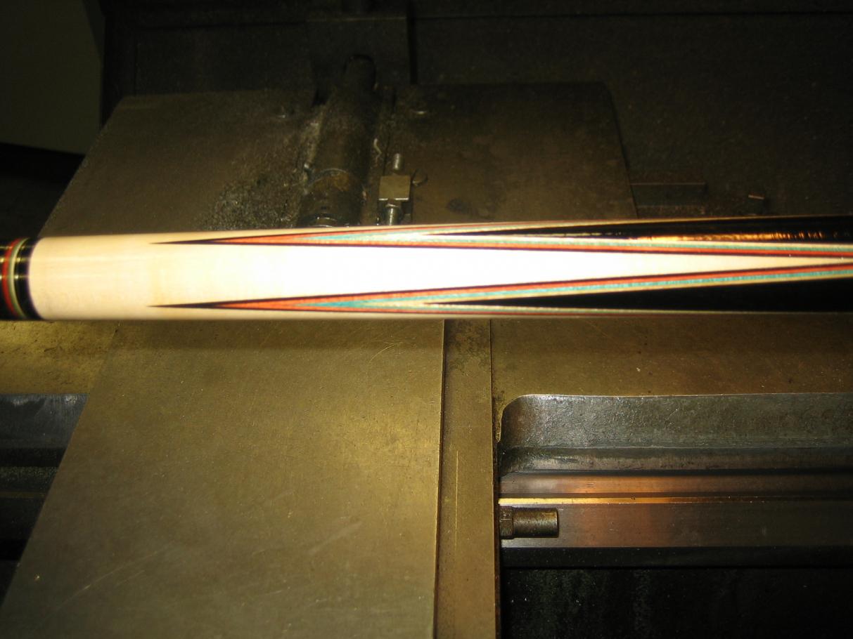 Fourth is the cue as it is now- with a coating of Cyano to keep every thing clean and stable. That will be cut off when I do my final taper after inlays.
