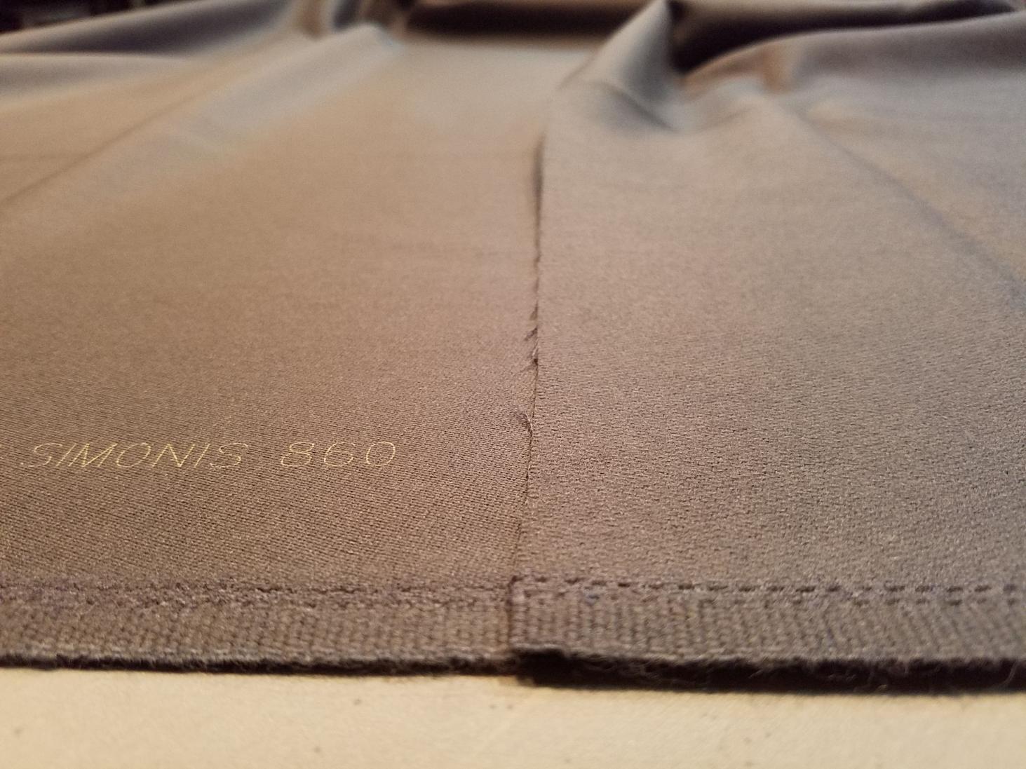The OP's cloth has been installed for a year, so most of the fuzziness would have been worn away by now. Also keep in mind, the OP's cloth is currently installed, so it is under tension. If you look at the first picture that he showed, you can see a well defined thread weave pattern in his cloth. It looks like straight channels in the cloth. Simonis only looks like that from the backside. When installed correctly, you have to look very carefully to see the weave, as the surface is quite smooth. The surface of the OP's cloth does not look as smooth as it should. Hence the comments about the "blue jean table".