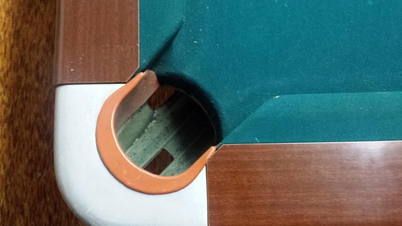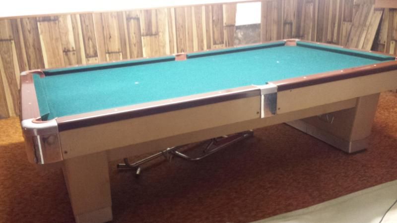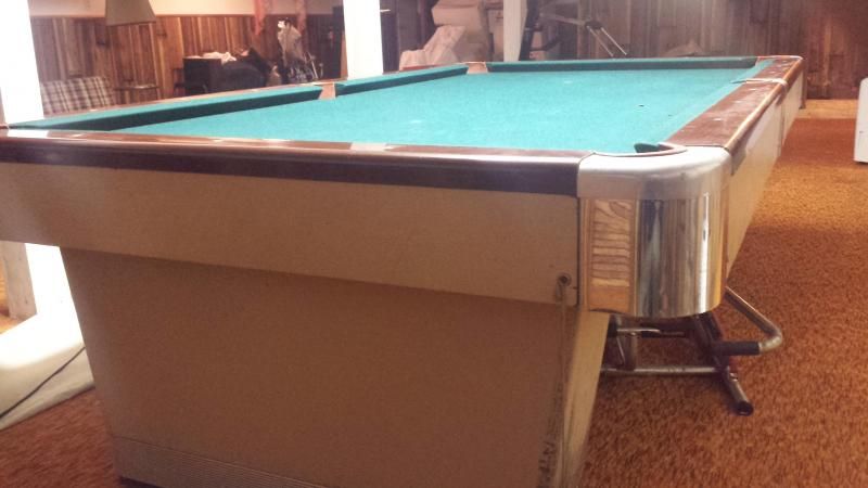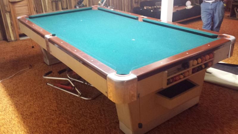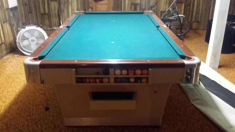 I've never seen a table like it. It is a nine foot three piece slate table. ball return to center and down into box (like modern day diamond tables).