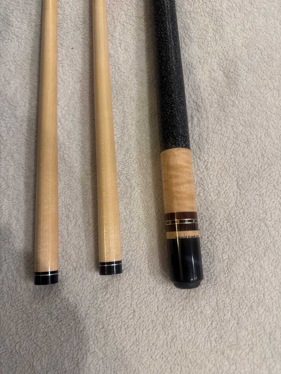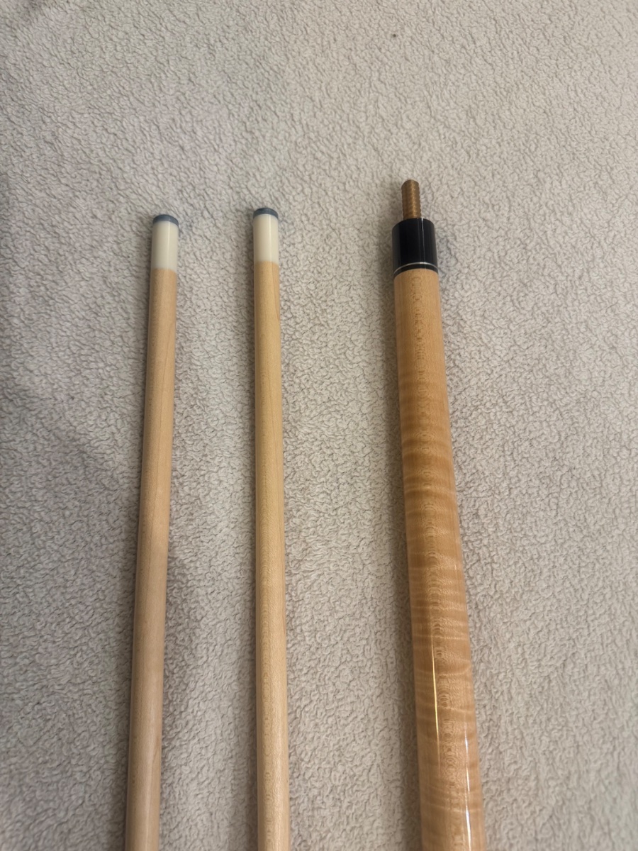 I have a Morris cue from 2004 that is brand new and has never been played. It is curly maple with rosewood ringwork one the bottom of the butt. 2 shafts. Brass pin Asking $1200.