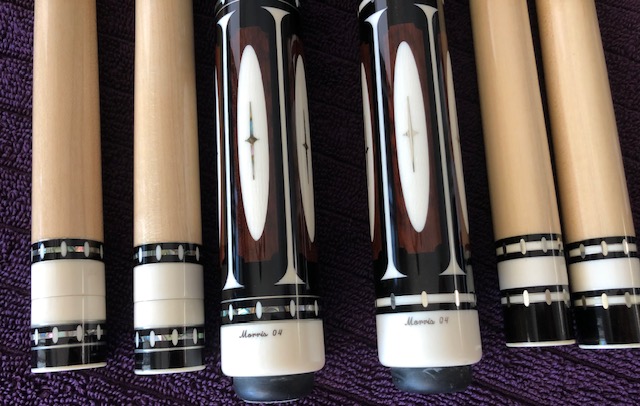 Here is a few pictures of the "twins" as I call them, but Ned Morris calls these his "pillars" because of the butt section. Everything white is ivory. I have four more that I will be posting in the next few weeks. These cues have never been used. One butt has abalone in the rings and shafts. The other has silver in the rings and butt. These came to me in a Porper case,