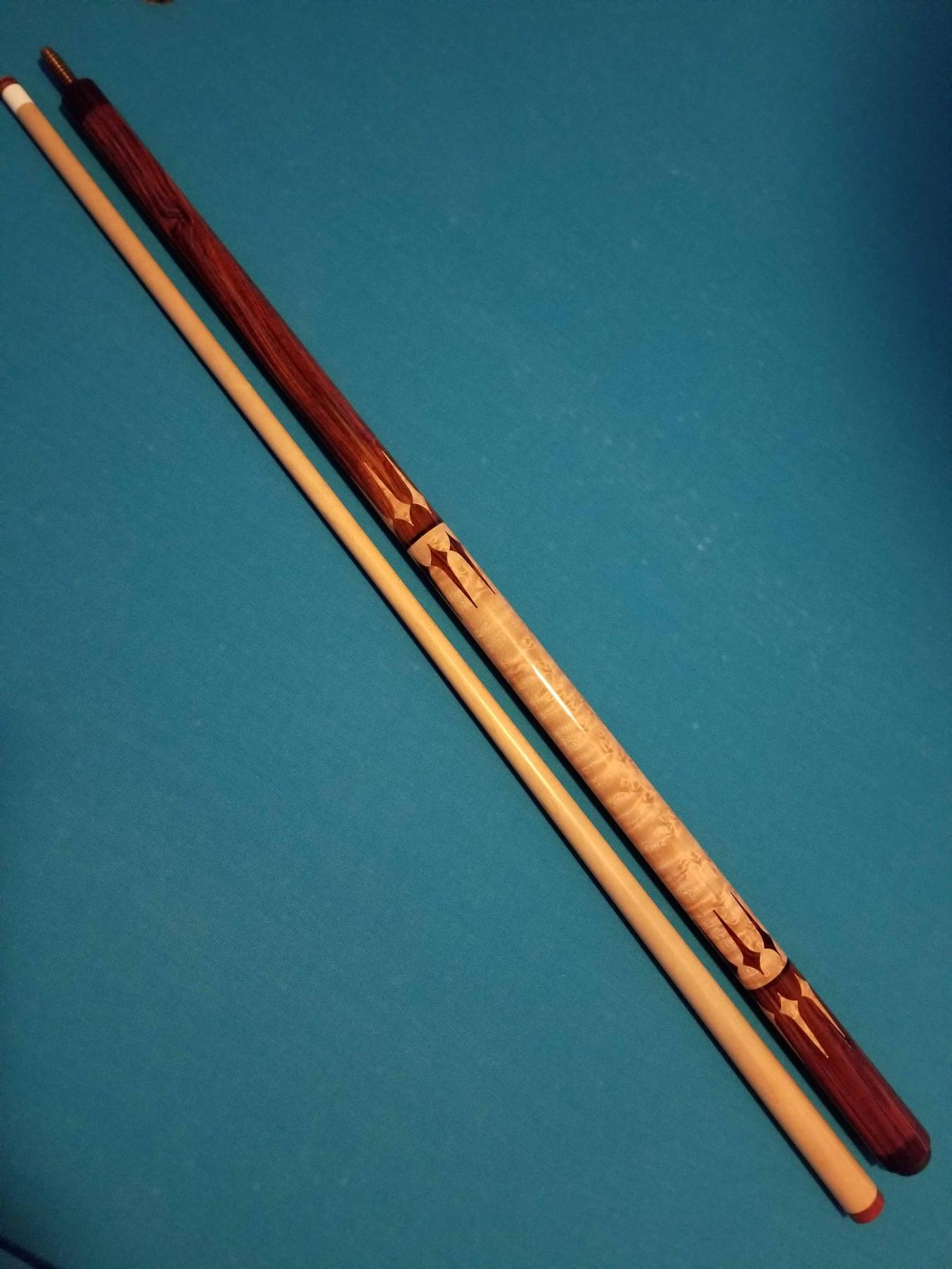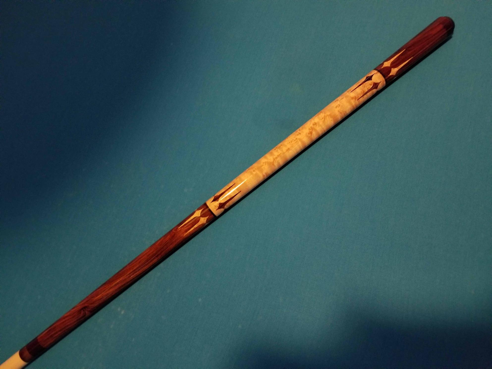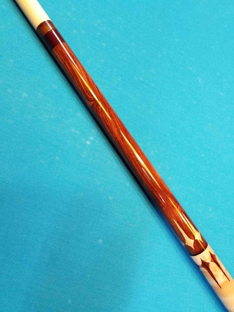 This cue has a nice solid hit and is made from beautifully figured Cocobolo and Birdseye Maple and has 10 Cocobolo and 10 Birdseye diamond inlays