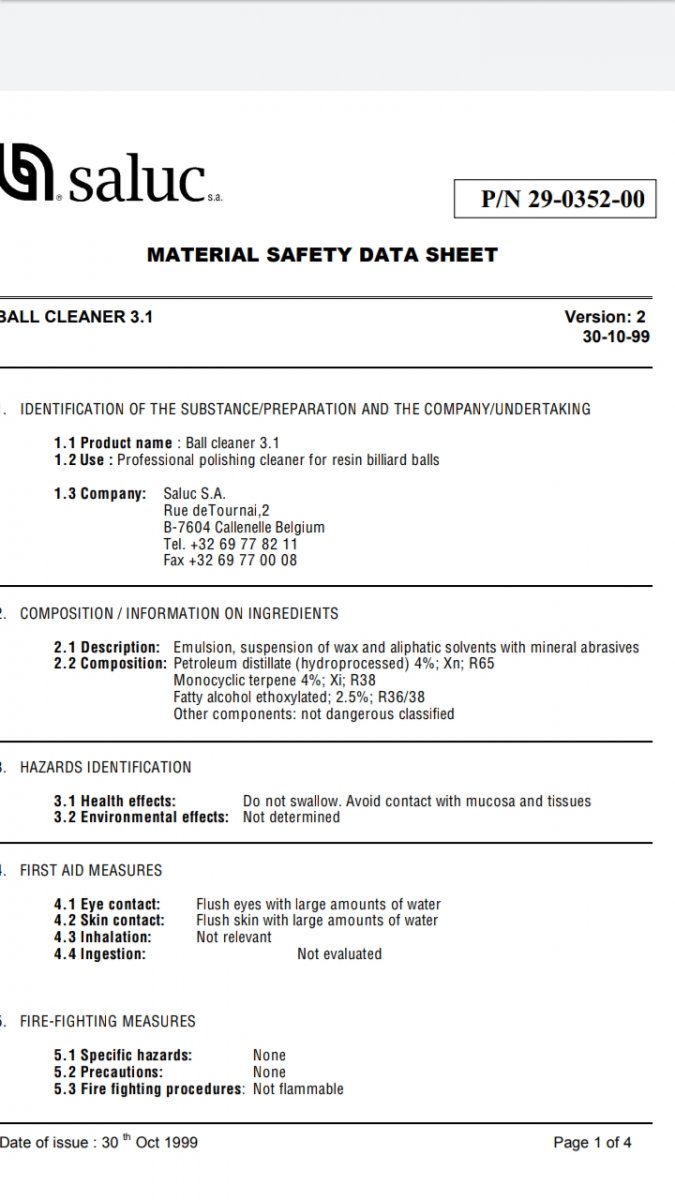 Wow! suspended wax, abrasives and petroleum distillate. Basically this is a combo of McGuire's rubbing compound and McGuire's regular liquid car wax. This tells me, that based on Aramith's own recommended formula, use most any comparable car product, and if you have a tough bug stain, use a little Aramith Ball Cleaner on your car. 😃