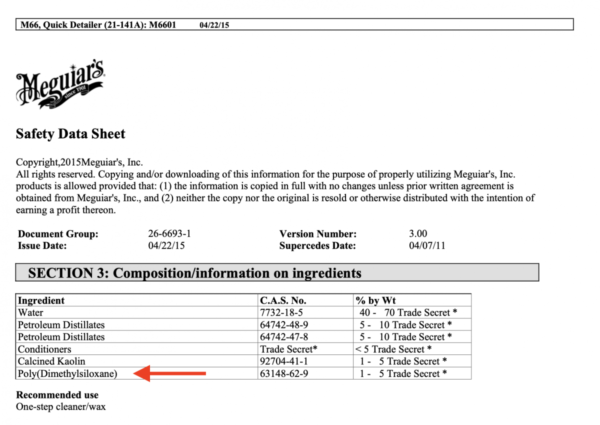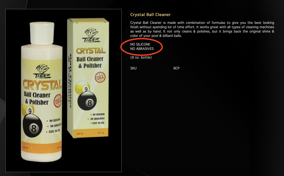 2. The Meguiar's product contains silicone (polydimethylsiloxane), the Tiger product does not. I don't think any of the purpose made pool ball cleaning solutions contain silicone. Trick shot artists use silicone to get the cue ball to react in an unnatural manner. Silicone also alters the properties of throw from one ball to another.
