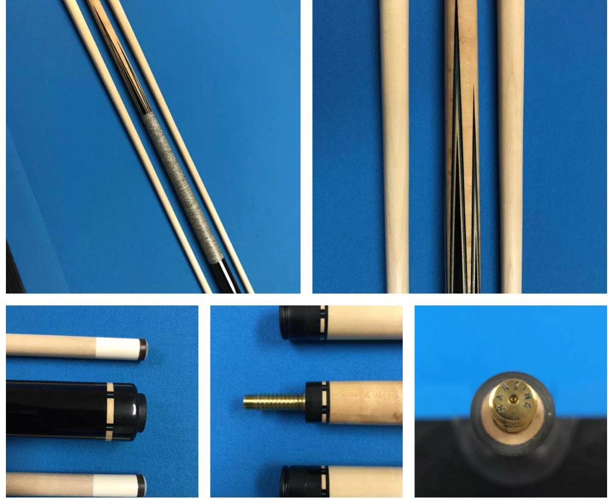 This cue features Six Razor-Sharp Points of Gabon Ebony into a nicely figured Birdseye Maple Forearm. The points are framed with Maple/Sky Blue/Ebony Veneers for a classic and elegant look.