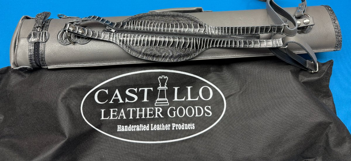 Castillo 2x4 Hard Leather Case. This handcrafted case boasts luxurious gray leather and a grey-colored ostrich leg accent, offering both style and protection for your cues. With the ability to transform into a backpack, it's the perfect companion for your travels.