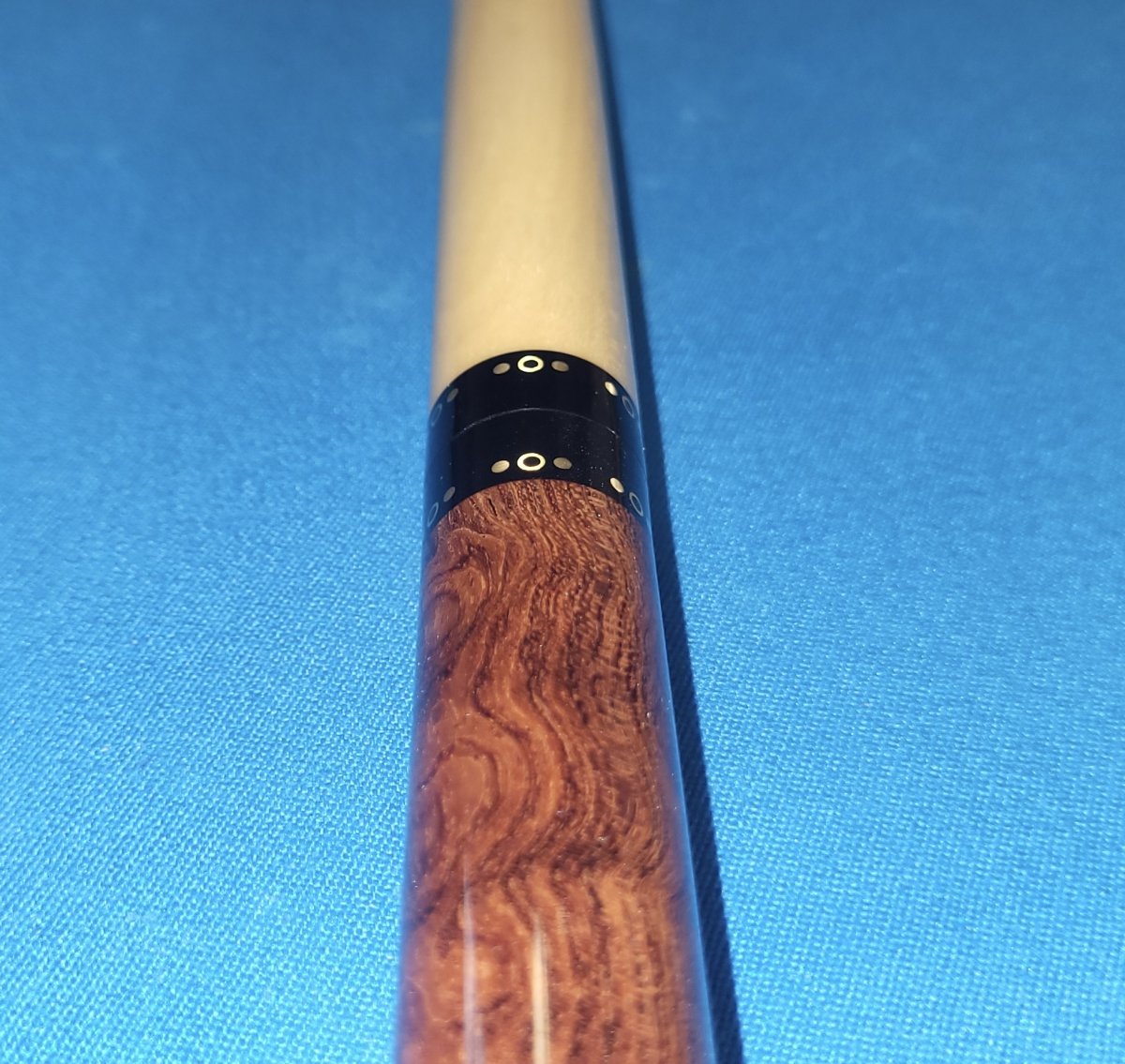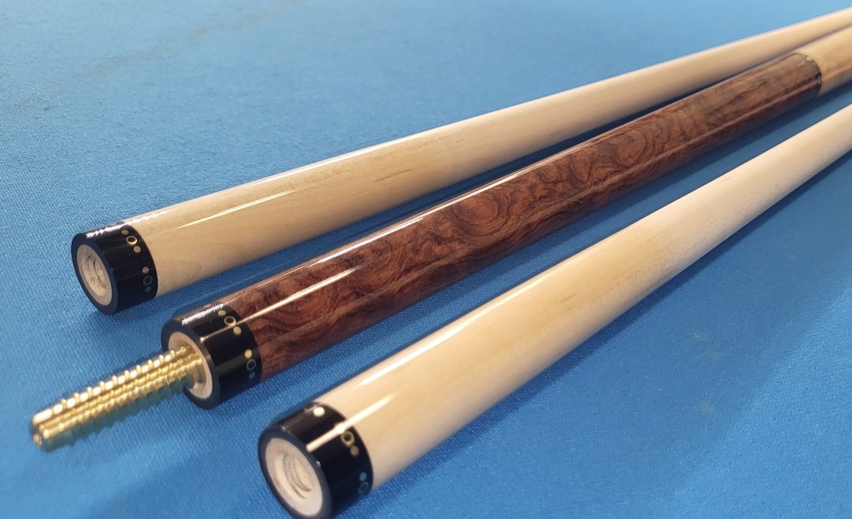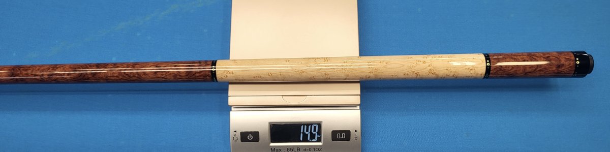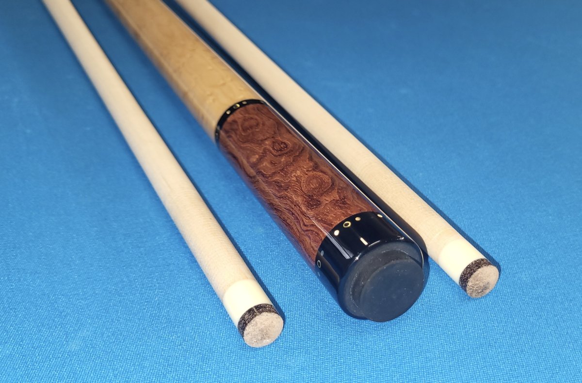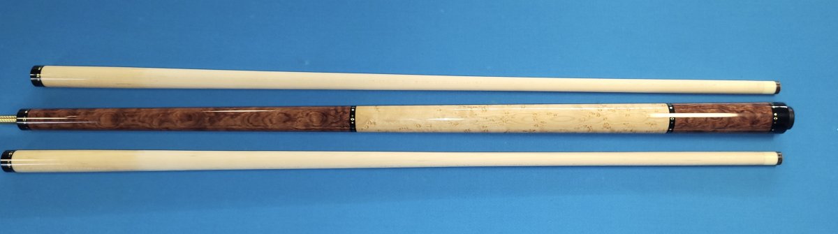 Brand new Crouch Custom Cue. 58" even split Bubinga and Birdseye with brass dot rings at all locations. Comes with 2 shafts bearing matching ringwork. 14.9oz butt 3/8-10 modified pin