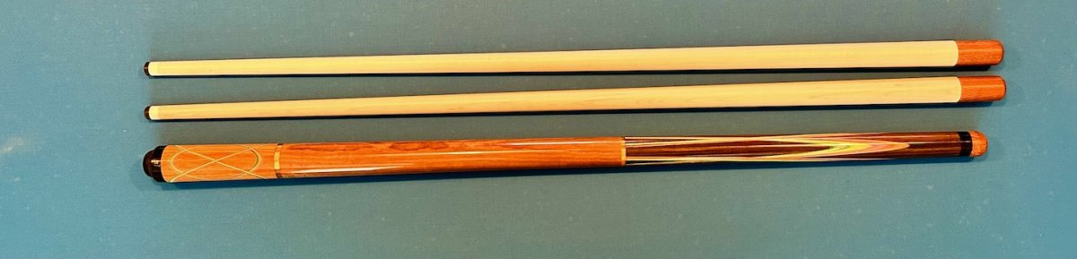 Here is a very traditional butterfly cue with non-traditional woods. Macassar forearm with veneers; Australian Red Gum cored handle, Marblewood buttpiece with "Lithium" woven rings, veneers matching forearm. 56"length, two 11.8mmEuropean taper (compound, not conical) shafts, 18.7 weight. $850 delivered in the US. (Paypal ID is my email.)