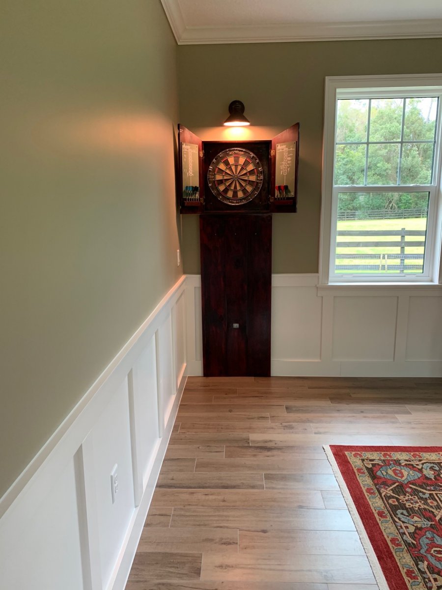 Will stick with the room for a bit .. had this dart board in a variety of garages over the past 30 years . .and finally have a good spot for it. Our electrician is a dart enthusiast .. he recommended offsetting it away from the window .. "because somebody will put a dart through it". So thats why it is a bit off center on that wall. Diamond gave me their stain supply contact and I was able to get a gallon of the cherry stain they use and I used that onThrow up a picture of the Cobra in the interim. Congrats on the table. Enjoy.