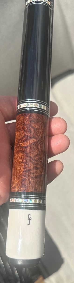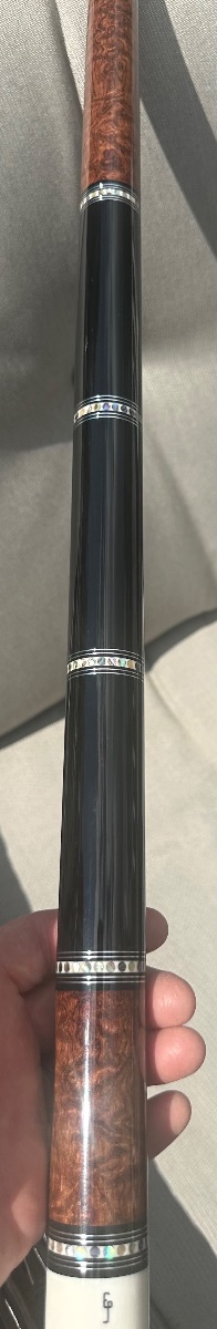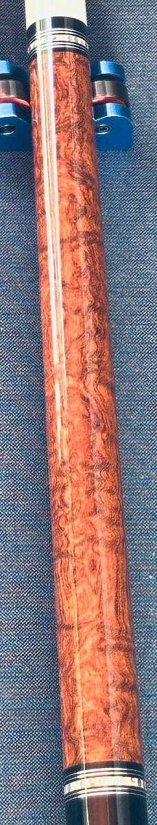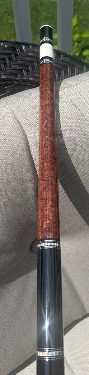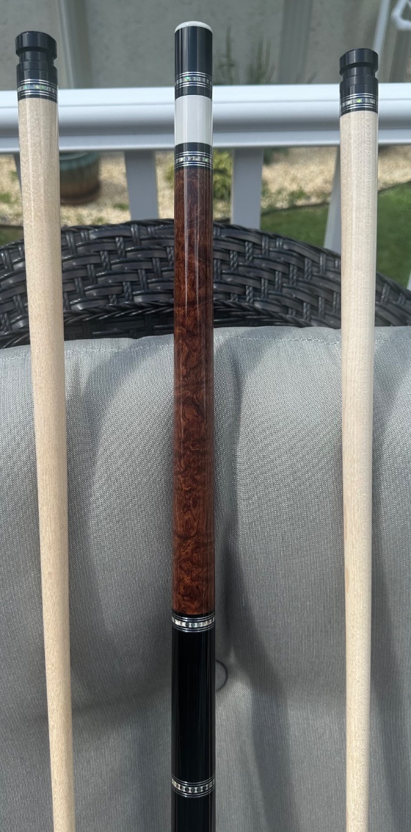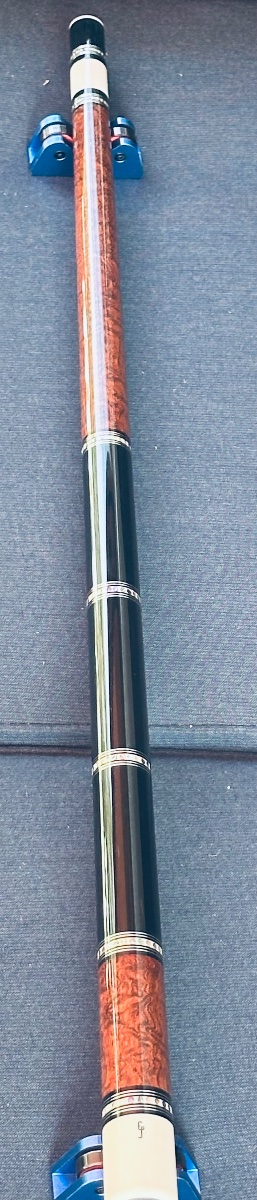 New Ed Prewitt 7 ring Waterfall bubinga with ebony segmented handle .2 maple shafts with Ed's Delrin joint protectors .The butt comes with the fancy joint protector .Butt weighs 15.3 oz.Shafts are 3.9 oz and 13mm. 3/8-10 flat face super tusk joint and super tusk buttcap .Shafts have 5/8" saber t ferrules with medium kamikaze tips .$5950 shipped in United States .PM if interested