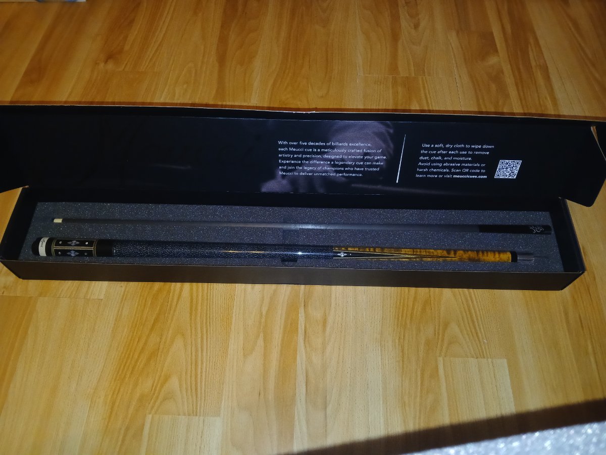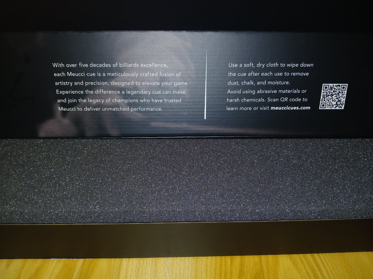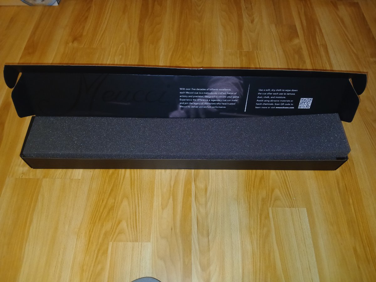 The cue arrived a few days ago. It was packed very well, with fragile decals all over the shipping box. Inside, I found a very attractive box with the Meucci logo, made in USA decals, and I was impressed to find the cue protected by foam that has been cut to protect the cue and shaft. Top marks for product presentation.