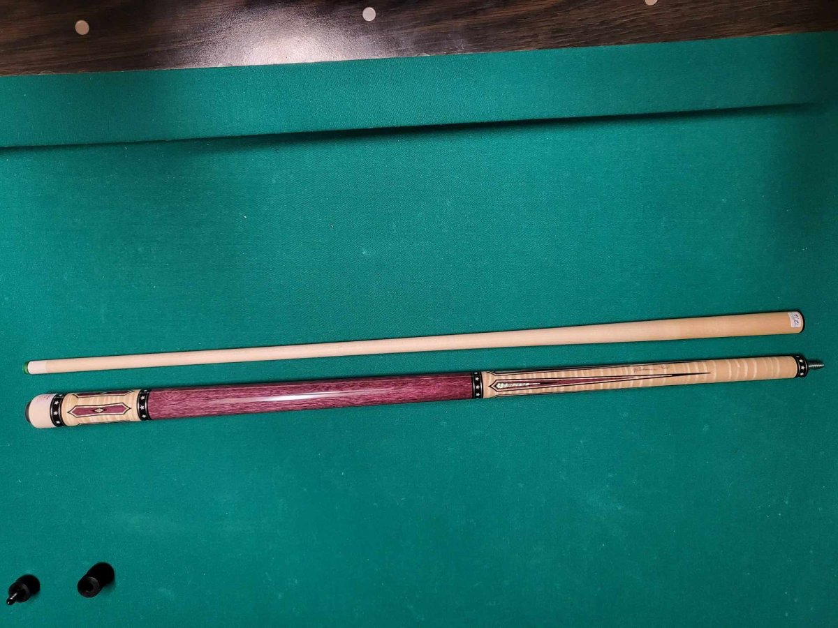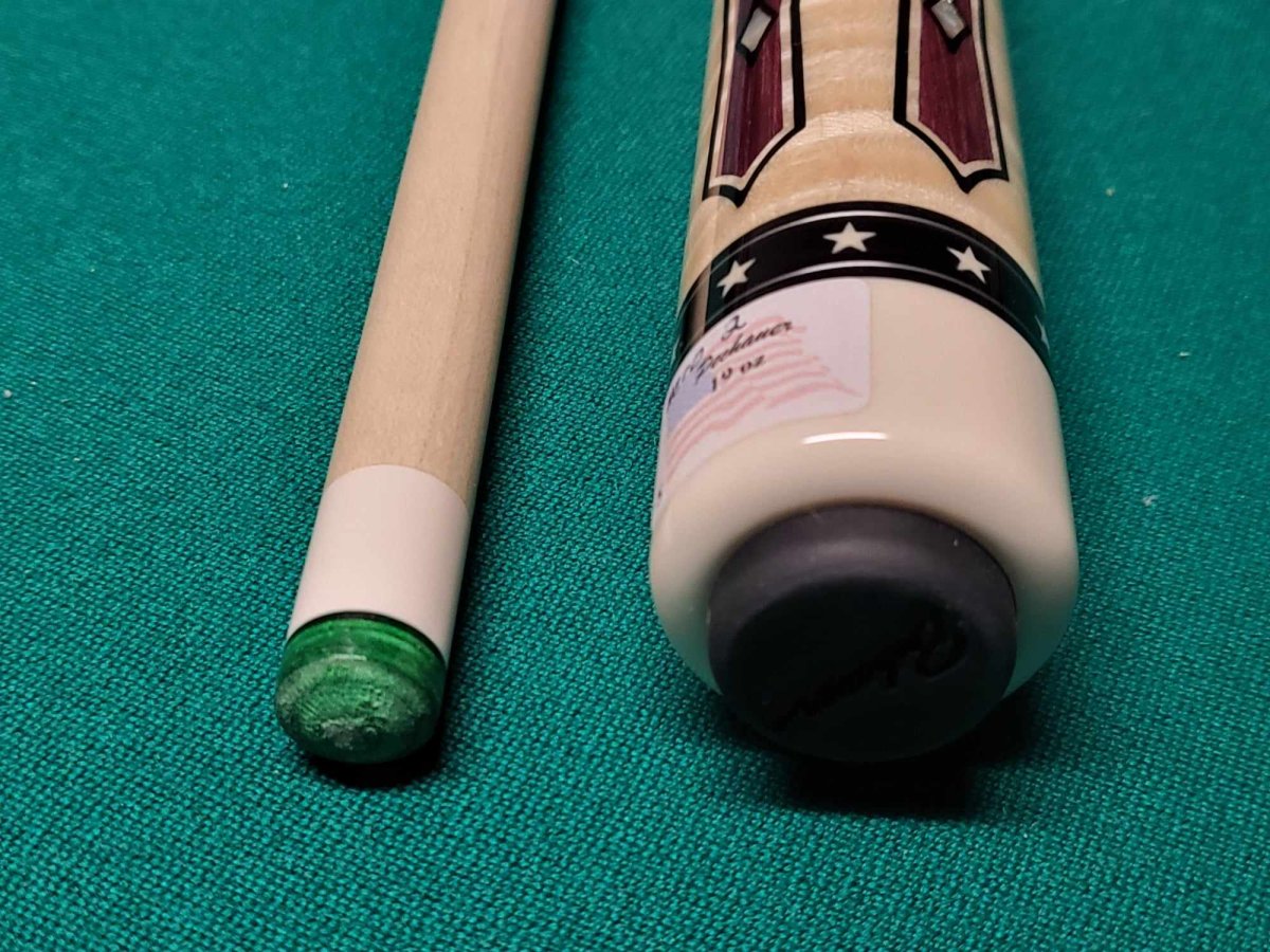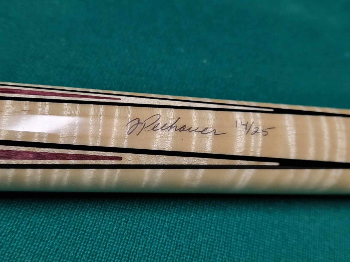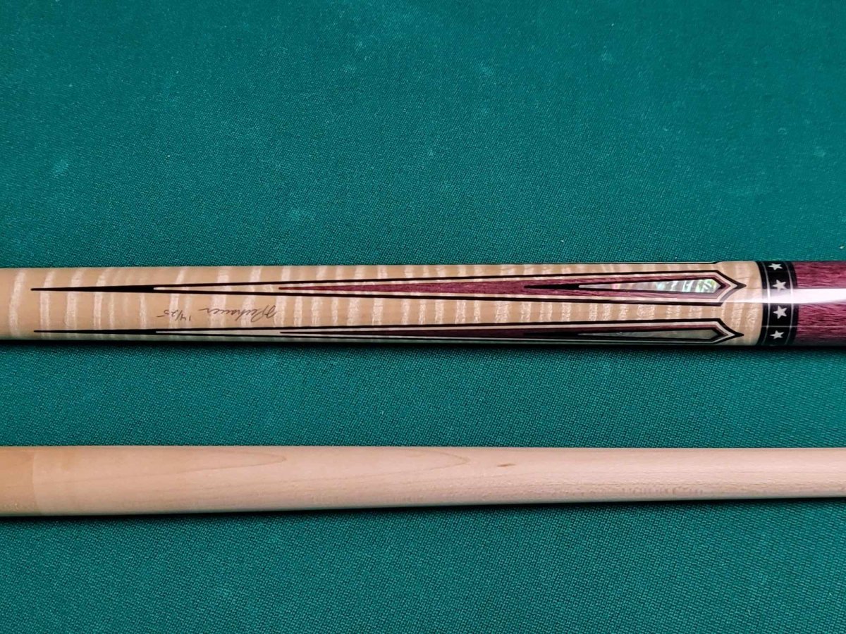 Hero 2 is hand-crafted using premium Purpleheart wood and figured maple. This limited cue features a Purpleheart wood wrap. A figured maple forearm and butt sleeve host exquisite Purpleheart wood and abalone inlays. White stars separate the sections, representing the patriotic spirit of our heroes. Hero 2 is limited to only 25 cues. This cue is numbered 14/25 and is standard 58" and 19oz and 12.5mm at the tip