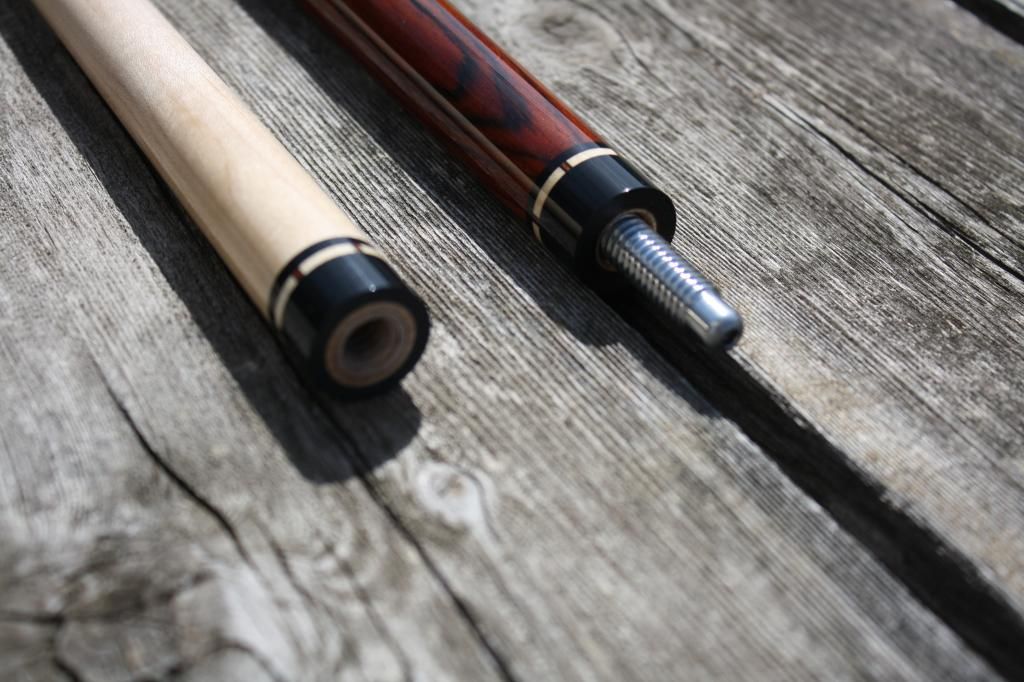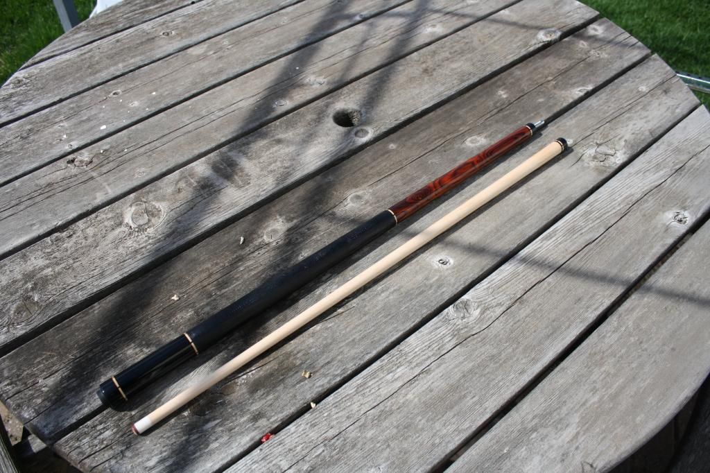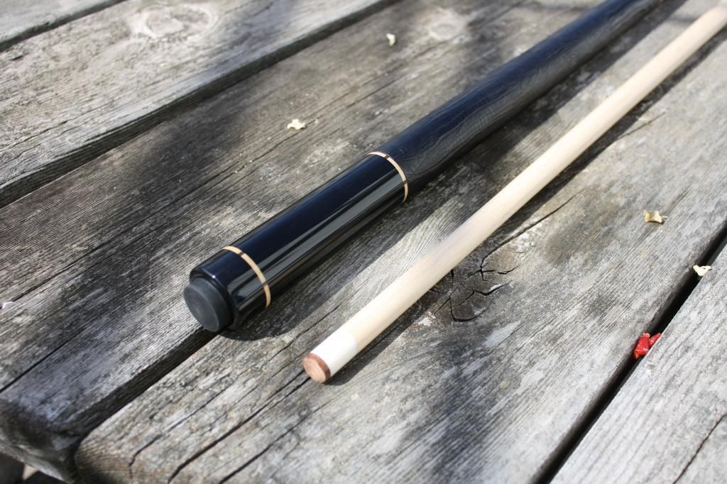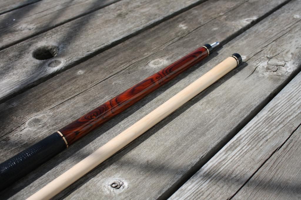 For Sale - Highly figured Cocobolo Forearm cue with ebony butt sleeve, black/brown stitched rings in all positions with lizard embossed leather wrap. Black phenolic joint and but.
