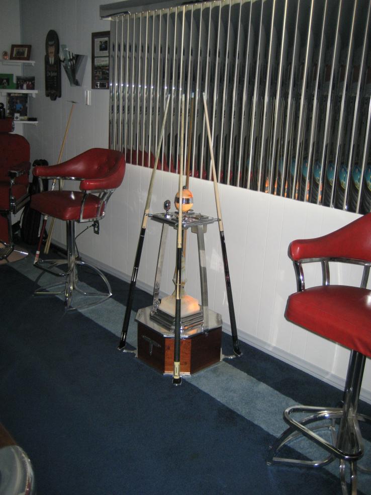 I searched for a ball polisher that I could leave in my home room that would blend in. I couldn't find anything so I decided to build my own with the help of Kent Davis the cue maker and Jim Carey (no, not that Jim Carey). Kent helped me build the cabinet and all of the techinical help for the inner workings came from Jim. The polisher works perfect and I"m very happy with it. I used a Bodine gear motor that has the perfect rpms. The chairs are saddle top for comfort.