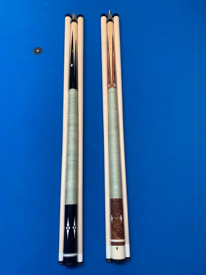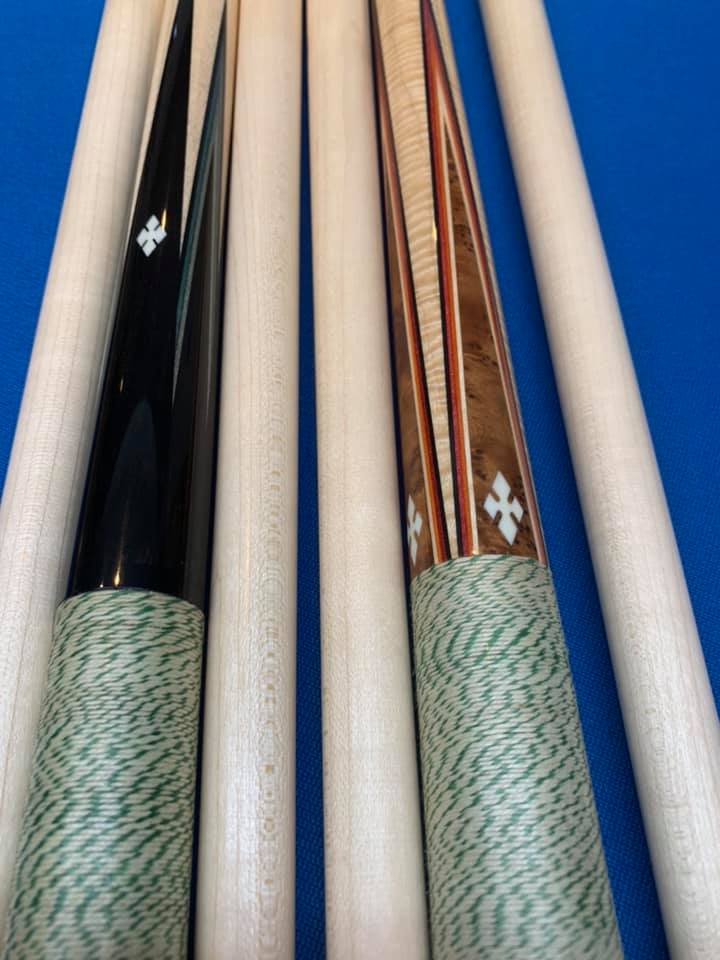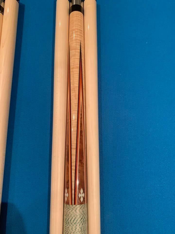 Here is 1 of the last 2 completed Tim Scruggs cues made out of his shop.This cue was assembled and inlayed by Mike Cochran Tim’s partner in Tim’s shop.