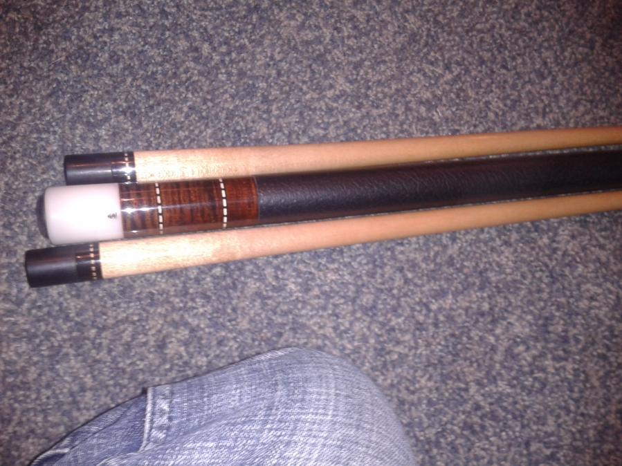 This is a nice, older Scruggs. It looks to be stained tiger maple. 3/8-10 flat-faced sleeved ivory joint. 2 original shafts with ivory ferrules. Tips look to be triangles, at 12.8mm. I do not have weights yet.