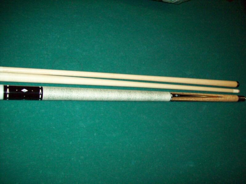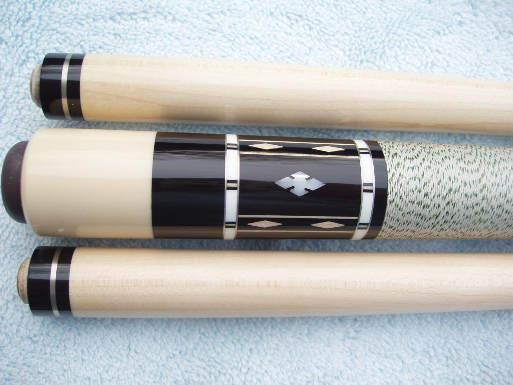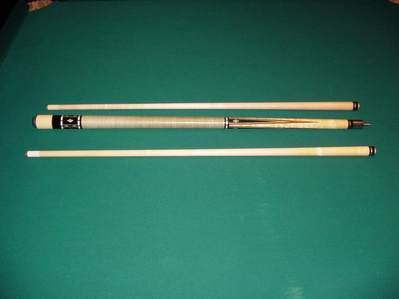 Here is one of my favorite older cues. This cue was made in the Adam Factory in Japan about 6 years ago. It was a prototype for the BU-1 in the Balabushka collector set. It doesn't have the little picture of Mosconi on the butt cap nor does it have the George Balabushka signature on the forearm. The points aren't dead even but other than that this cue is about as good as they get out of a factory door. It's still as straight as a string and very solid. The butt weighs 15.1 oz and each shaft is 4.4 oz/13.0mm.