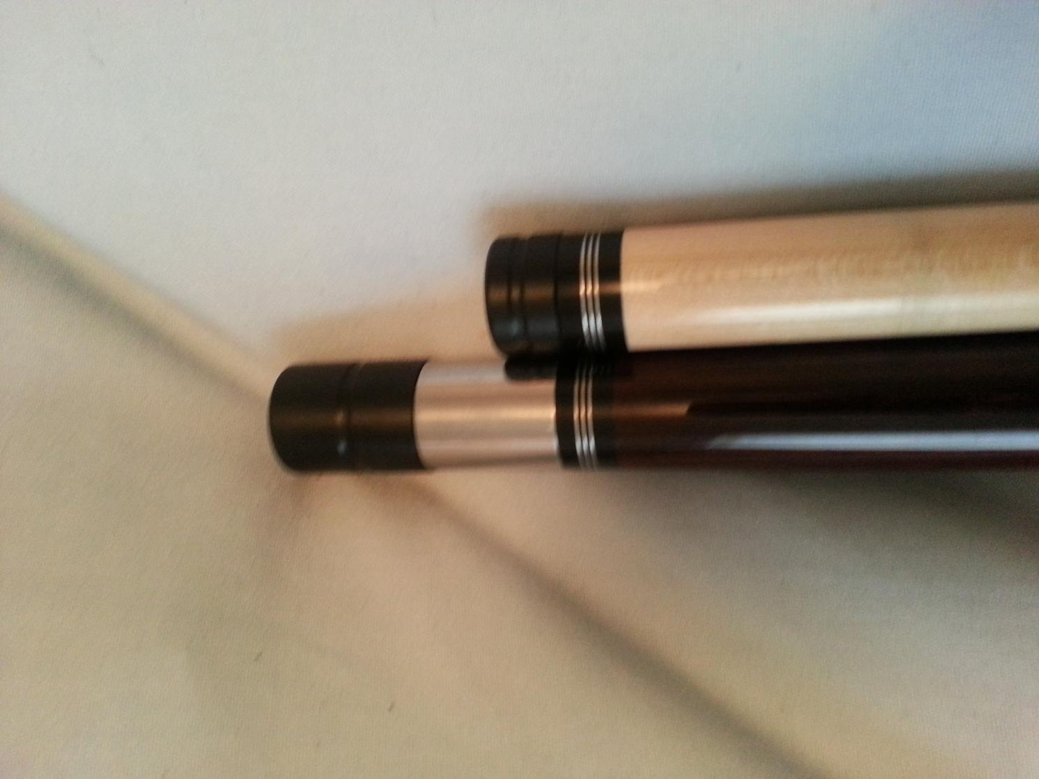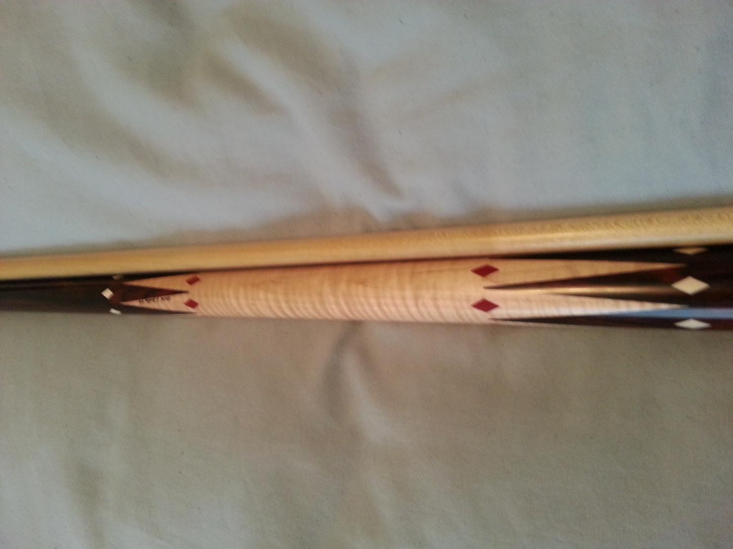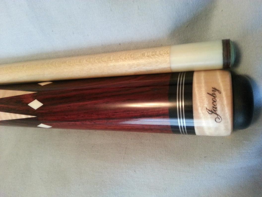 I have a custom wrapless Jacoby cue I'm willing to do some trading with. I believe it's 19 oz. It has a 13mm tip, not sure of the tip brand, I have not changed it. Cue has only been test hit a few times, in pretty much new condition still. Has triple rings at joint and collars. I was told the white is ivory and the red is pink ivory. I'm looking to possibly trade for either a Pechauer, Predator or a Schon. If interested please PM me.