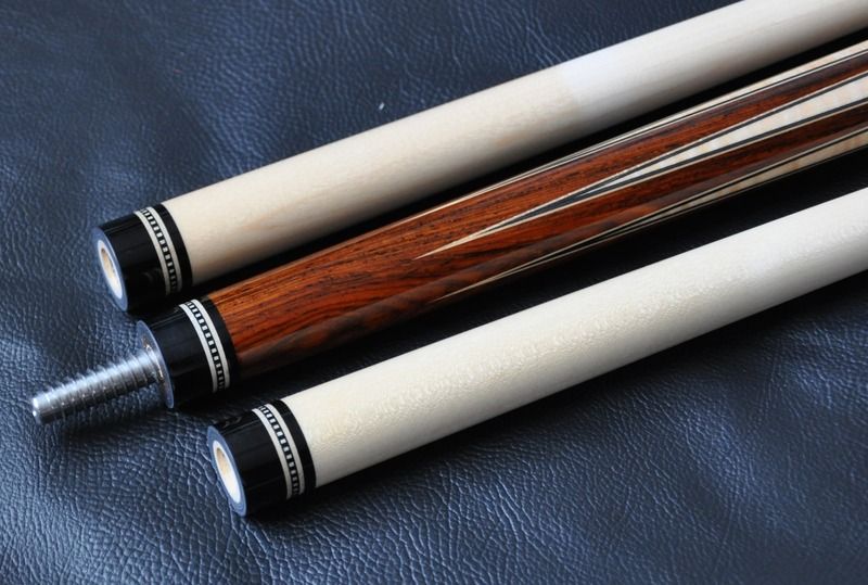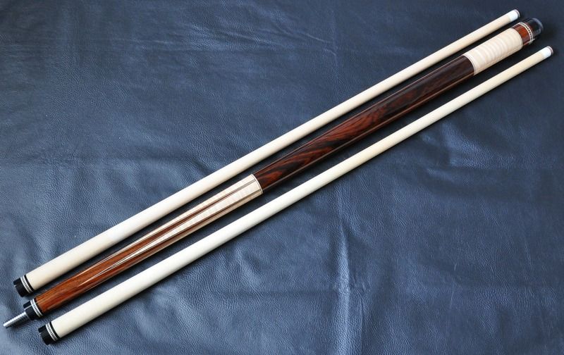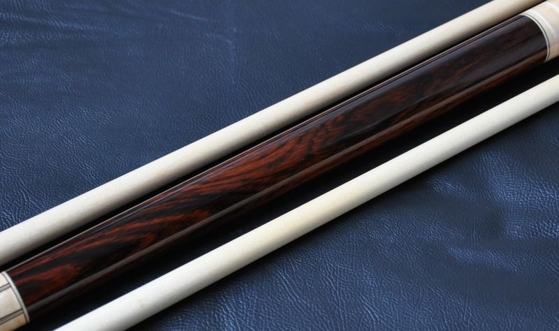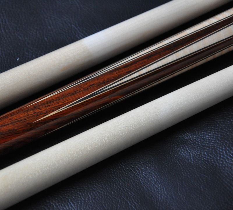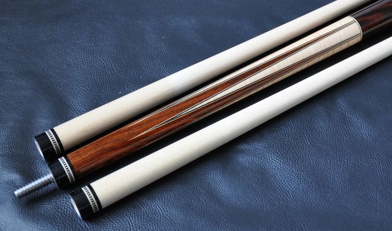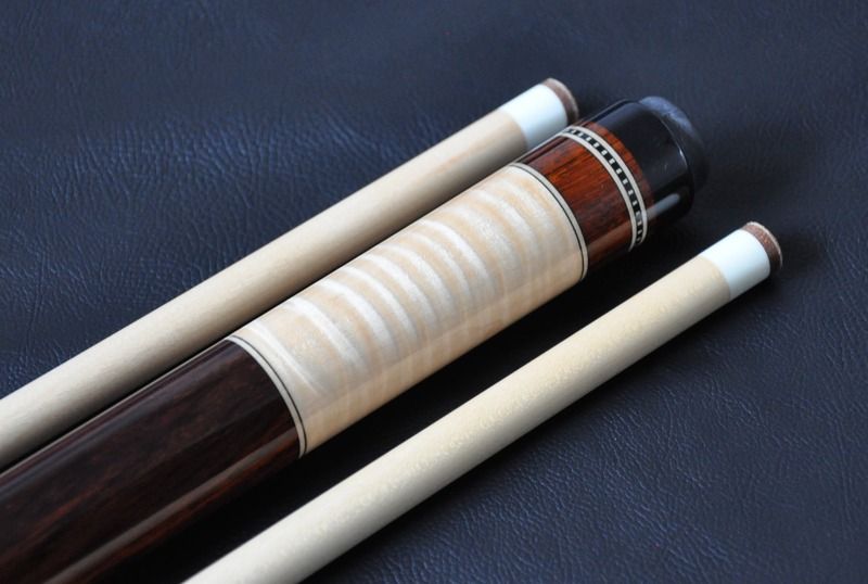 Here is a wrapless, equal length 6 Point Kent Davis that was just delivered today. They curly maple in this cue is very hard to capture but the curls are tight and vibrant.