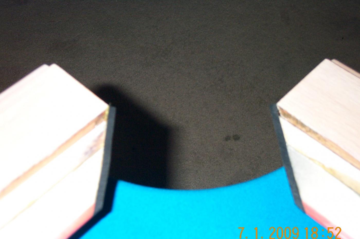 While I was at it, I put Artemis Pool 66 cushions on, and replaced the facings with 3/16" neoprene with a durometer rating of 60A. Grainger sells this in 3"x36" strips and one strip was just enough for a single table. My pockets were originally to BCA specs, and although I didn't particularly want to tighten them up, I did want to go thicker based upon RKC's experience with 1/8" facings stencil-cutting the cloth.