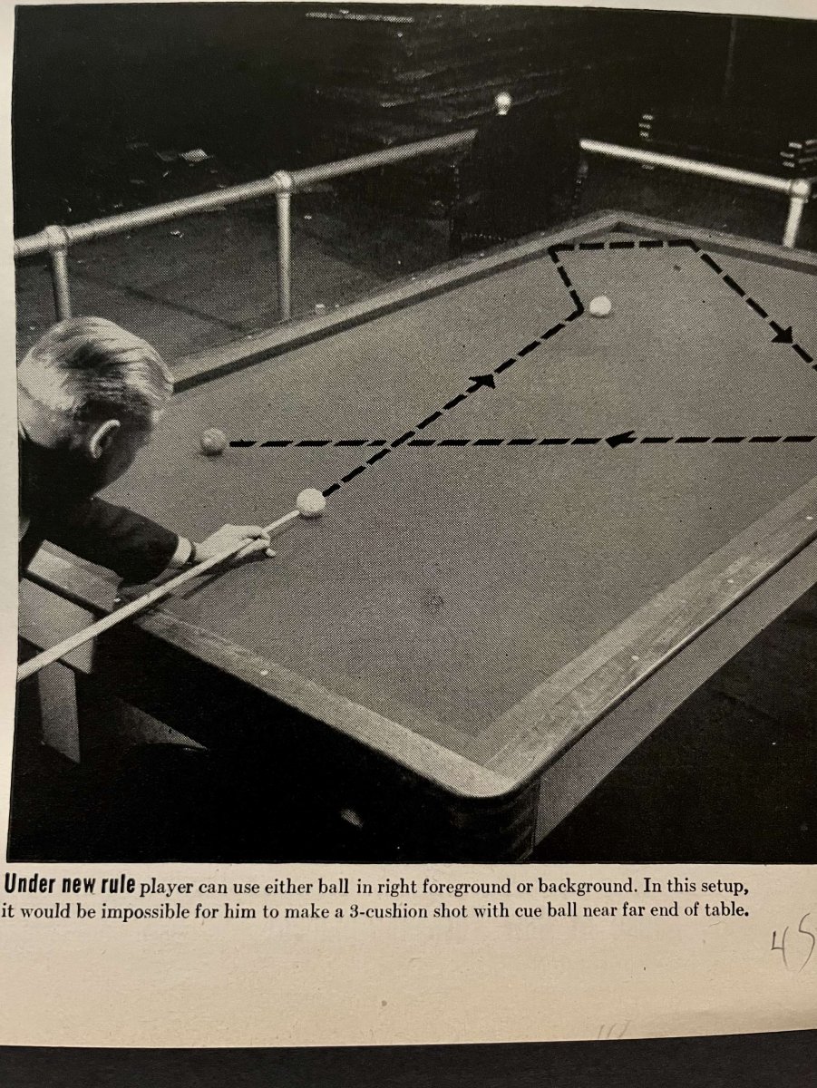 Under new rule player can use either ball in right foreground or background. In this setup, it would be impossible for him to make a 3-cushion shot with cue ball near far end of table.