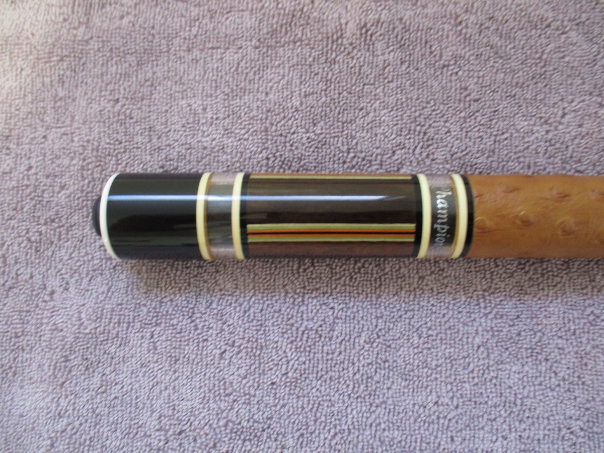 I like your cue, I had a green one quite a while ago. I like light cues and that one was a 16 oz. That's hard to find. I wish I had hung on to it and a thousand others I can think of, Lol.I like your cue, I had a green one quite a while ago. I wish I had hung on to it and a thousand others I can think of, Lol. Here is a rather lovely old Champion cue with a Palmer forearm. EnjoyView attachment 682941View attachment 682943View attachment 682944e share one more it is a very early Champion cue. I hope you enjoy it.View attachment 682941View attachment 682943View attachment 682944