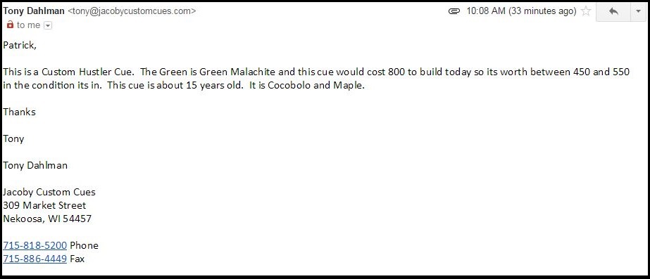 I emailed Tony Dahlman from Jacoby Custom Cues to find out more information on the cue.