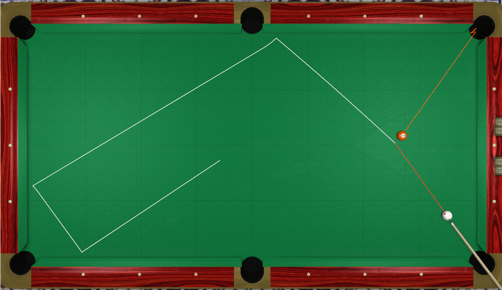 This is what the shot looks like in VP in isolation. (I don't want to spend the time to get all the other rack balls perfect.) As you can see from how far the cue ball goes, it doesn't require all that much force. It is a thinner cut than most like. It is a chance to win the game immediately and the cue ball is unlikely to scratch after multiple kisses with that relatively low speed. Of course the side pocket scratch is out of the equation due to the other rack balls. I'm still banking the 4.:giggle: