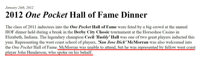 And Hendy stood in for him at his 2012 induction.Dick was One pocket Hall of Famer, and regular here before his death.