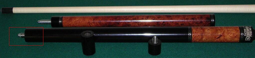 I hope that Purdman doesn't mind me using his photo, but in it I can show everyone how Mike told me that you can identify one of his Jump/Breaks that is custom made. Look at the pin coming out of the bottom butt end. You see that it has the 3/8-10 thread that Mike uses on his joint. Mike says that the ones he made have this thread on the butt end. The ones made over seas will have a quick release pin in this location.manwon said:You are aware that many of these so called Original Sledgehammer cues were made in China by Kao Kao. I do not know how many Mike personally made, or how to identify them from Chinese models, but these were the first made and are known as originals.